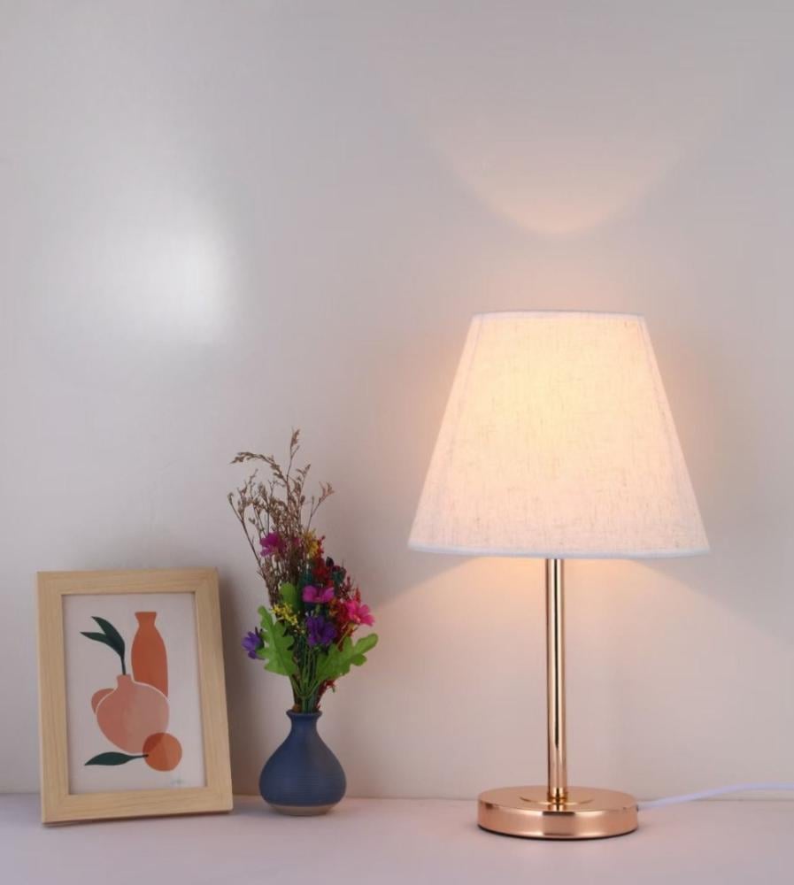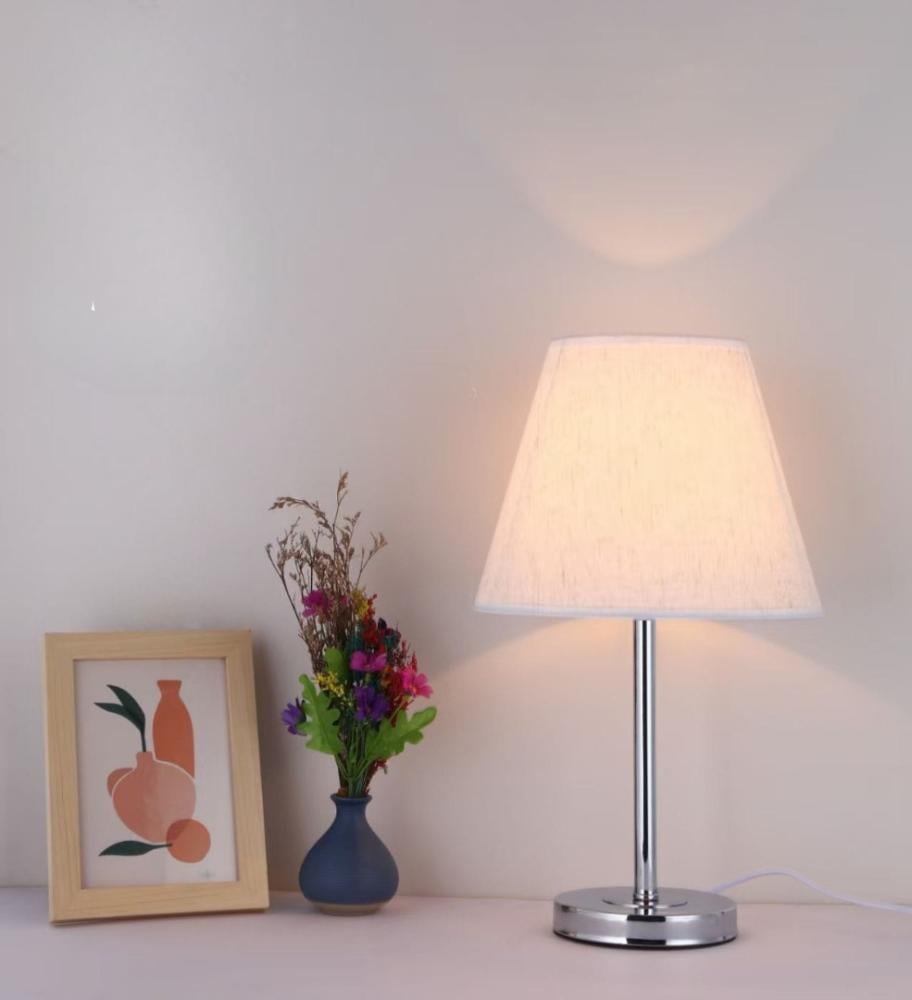 يعلو القاعدة والعمود غطاء مصباح مخروطي الشكل، مصنوع من قماش أبيض ناعم وعالي الجودة. يتميز هذا الغطاء بقدرته الفائقة على نشر الضوء بشكل متساوٍ ولطيف، ليخلق إضاءة دافئة ومريحة تخفف من حدة التوهج وتضفي أجواءً هادئة ومريحة على الغرفة. سواء كنت ترغب في إضاءة خافتة للقراءة قبل النوم، أو إضاءة محيطية دافئة لغرفة المعيشة، فإن هذه الأباجورة توفر لك المرونة المطلوبة