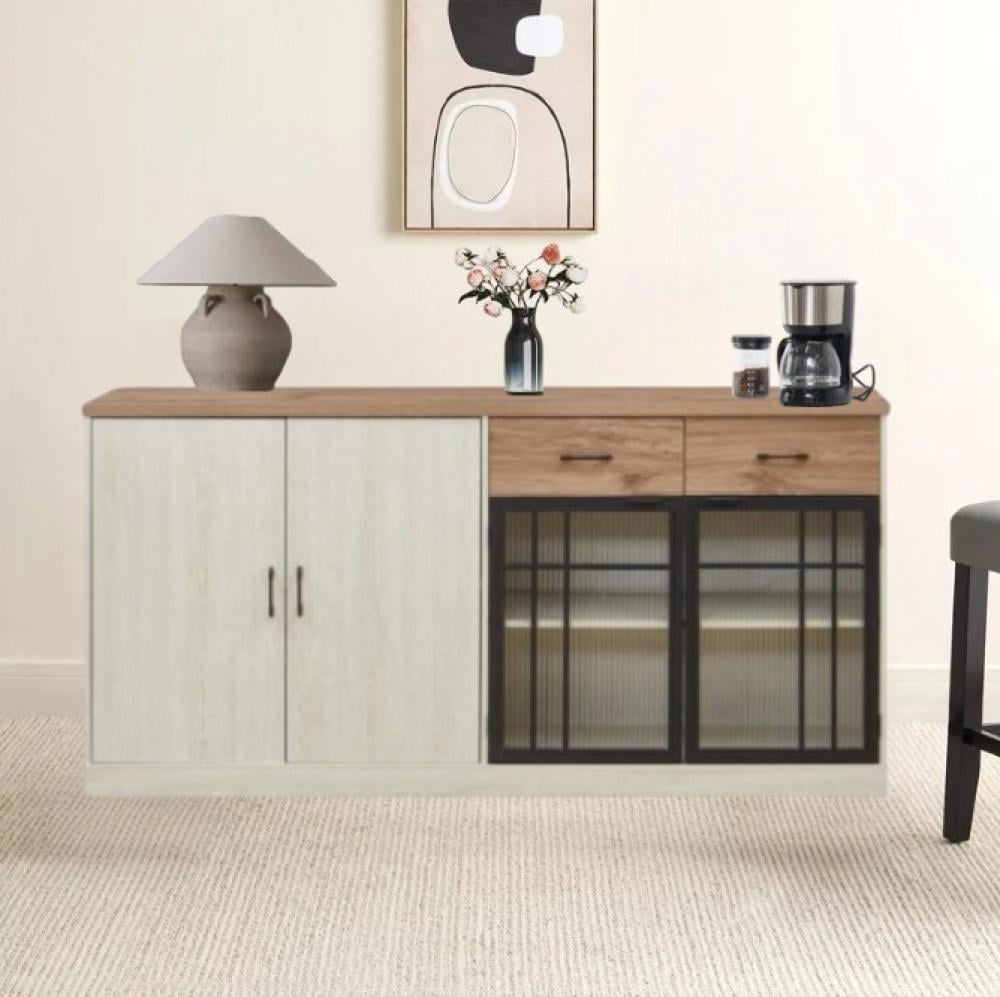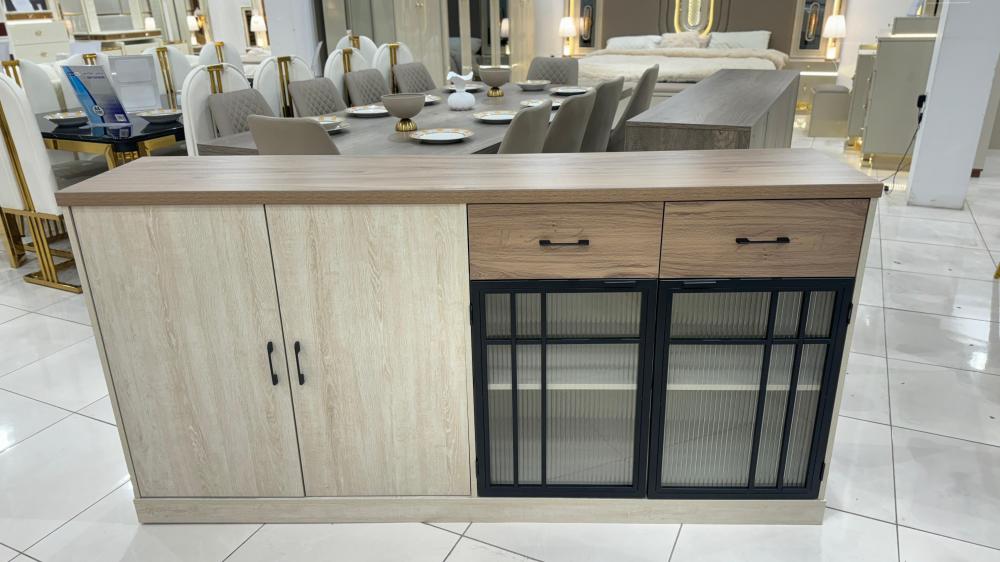 يتميز البوفيه بتصميم فريد يجمع بين لونين خشبيين متناسقين: جزء بلون خشبي فاتح ، وجزء آخر بلون خشبي أغمق يضيف عمقًا وتباينًا جذابًا. الواجهات الأمامية تجمع بين أبواب صلبة على أحد الجانبين، توفر مساحة تخزين مغلقة ومنظمة، وأبواب زجاجية ذات تأثير مضلع على الجانب الآخر، مثالية لعرض مجموعاتك المفضلة من الأواني، الكتب، التحف، أو أي عناصر ديكورية ترغب في إبرازها وحمايتها من الغبار. الجزء العلوي من البوفيه يضم درجين عمليين لمزيد من حلول التخزين الصغيرة.