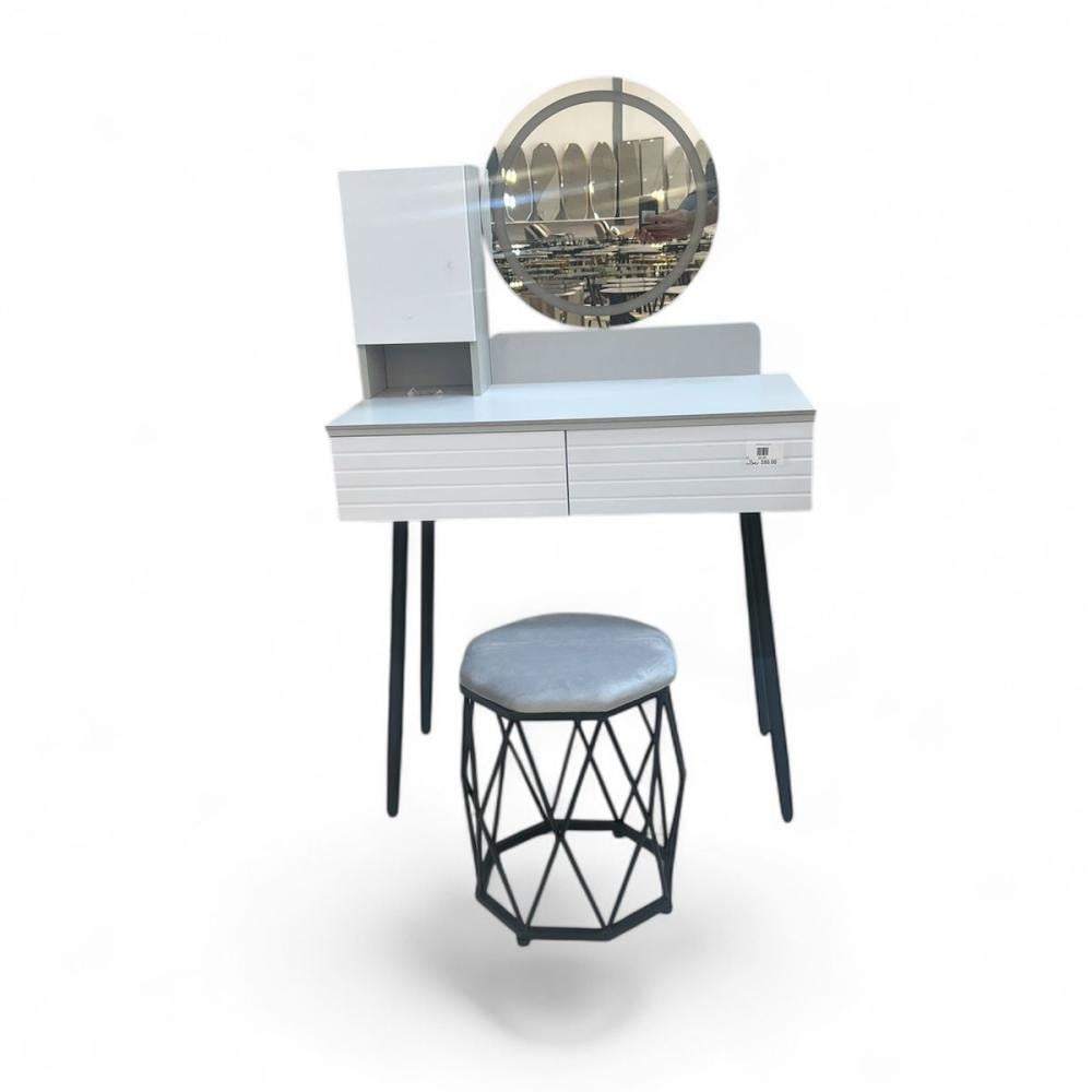 تسريحة عصرية بتصميم أنيق وعملي، مثالية لغرفة نومك. تتكون من طاولة بيضاء بلمسة عصرية مع درجين لتخزين مستحضرات التجميل والإكسسوارات. مرفقة بمرآة دائرية أنيقة ورف جانبي لتنظيم أغراضك بشكل مثالي. يأتي مع التسريحة كرسي مكياج بتصميم هندسي فريد، مما يضيف لمسة عصرية وفنية للمجموعة. تصميمها المدمج يجعلها مناسبة للمساحات الصغيرة والكبيرة