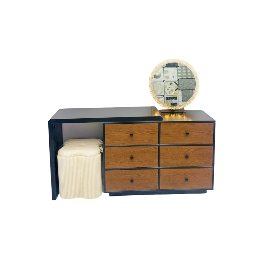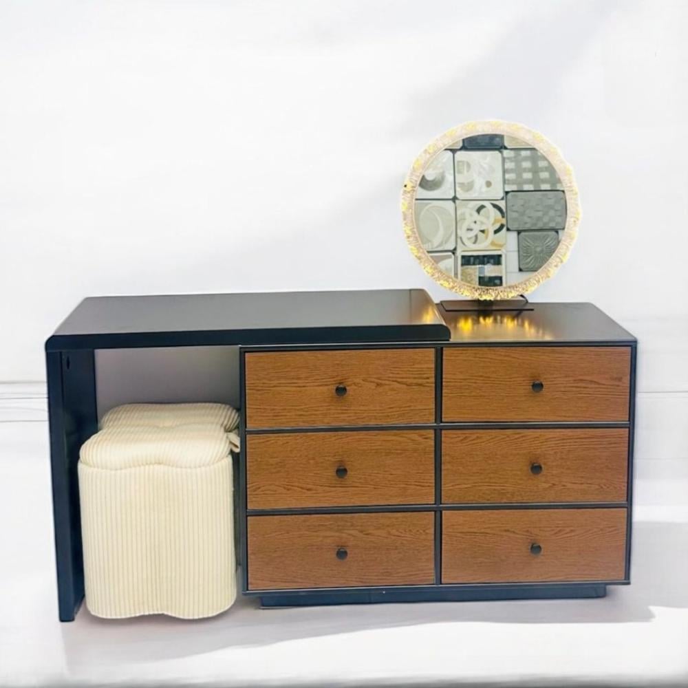 قطعة أثاث عصرية بتصميم مبتكر يجمع بين الأناقة، العملية، والتخزين الذكي. هذه التسريحة تتميز بسطح علوي باللون الأسود الأنيق، يمتد ليُشكل زاوية مفتوحة توفر مساحة إضافية أو يمكن استخدامها كجزء من مكتب صغير. الجزء الرئيسي من التسريحة يتكون من وحدتي أدراج متجاورتين، كل منهما تحتوي على ثلاثة أدراج واسعة، بإجمالي ستة أدراج. هذه الأدراج مصممة بتشطيب خشبي دافئ يضفي لمسة طبيعية وراقية، مع مقابض سوداء بسيطة تكمل المظهر العصري.