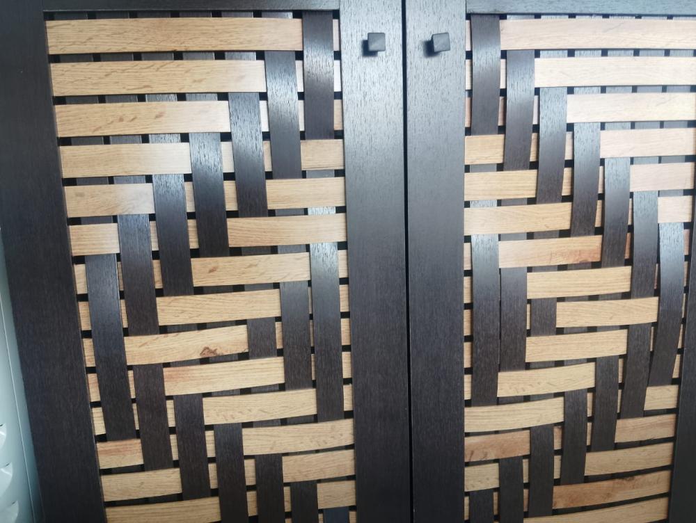 - تصميم مبتكر: يتميز الدولاب بتصميم فريد على الأبواب، يجمع بين الخامات المختلفة لخلق مظهر جذاب وغير تقليدي.