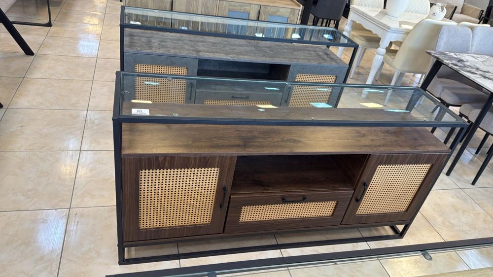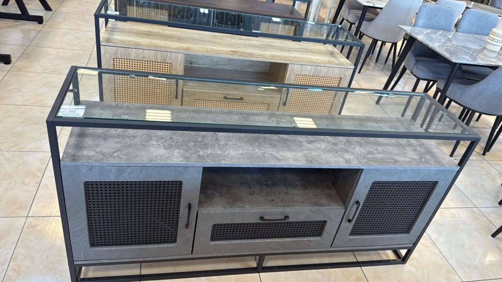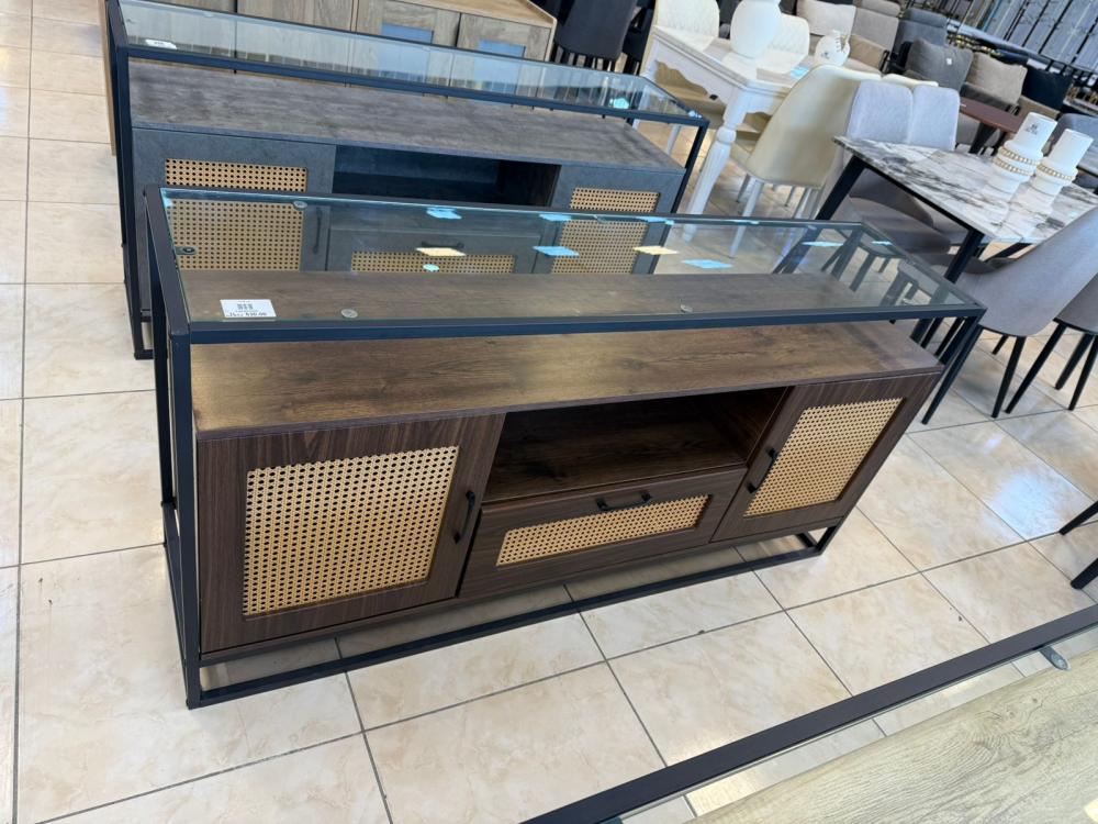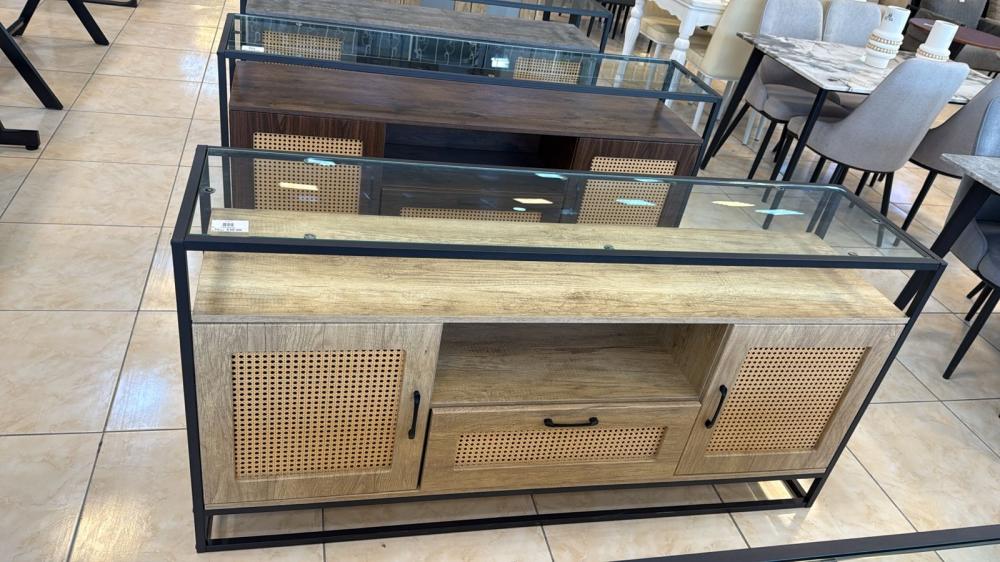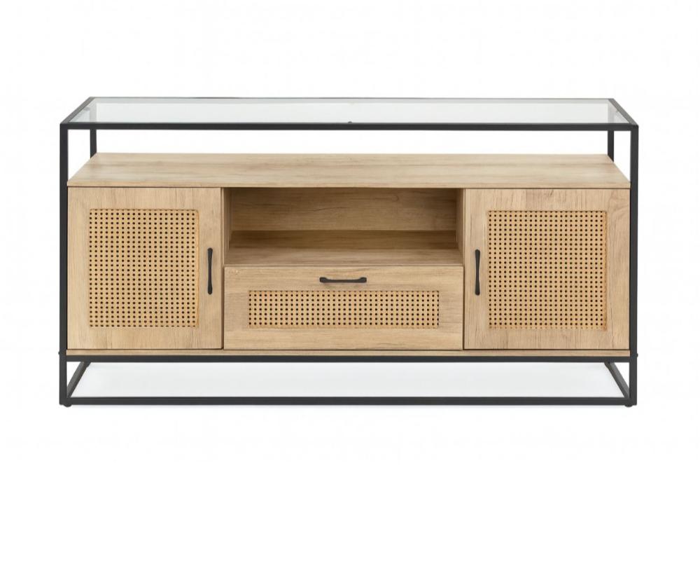 تصميم عصري وأنيق: تتميز طاولة التلفزيون هذه بتصميم عصري يجمع بين الأناقة والبساطة. الإطار المعدني الأسود يضفي لمسة من الحداثة، بينما الألواح الخشبية والجزء الشبكي يضفون لمسة دافئة وعصرية.
