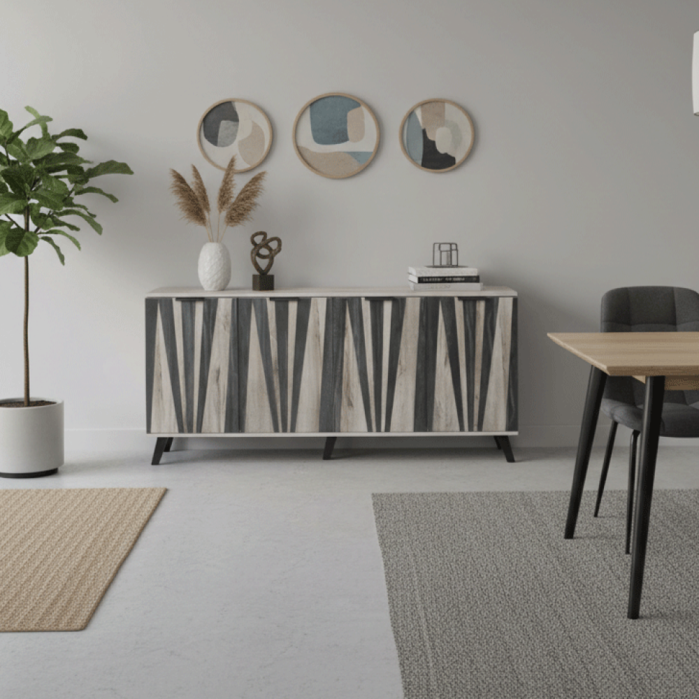 - أناقة متعددة الاستخدامات: مناسب كدولاب استقبال في المدخل، أو كقطعة بوفيه جانبية في غرفة الطعام، أو حتى كخزانة عصرية في غرفة المعيشة.
