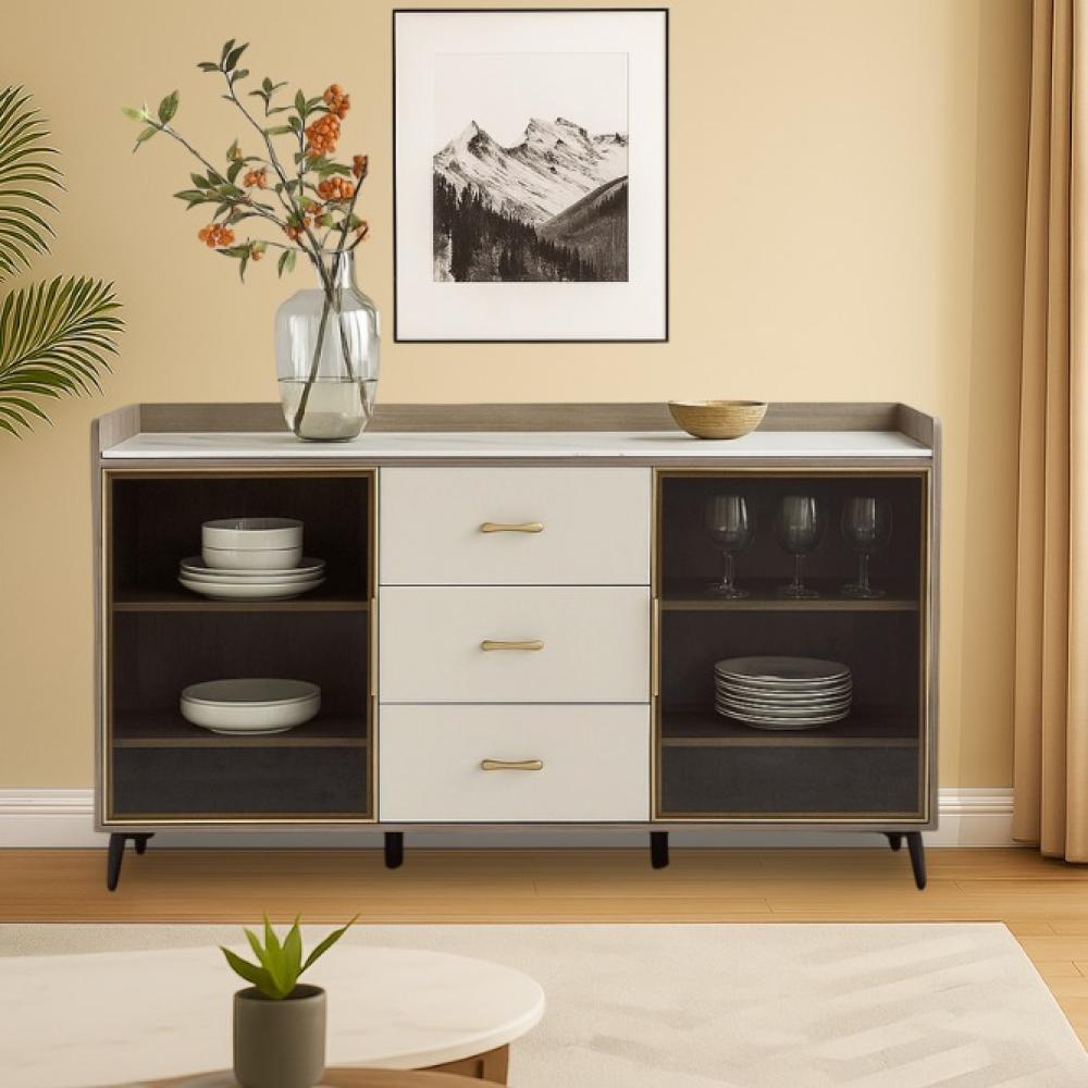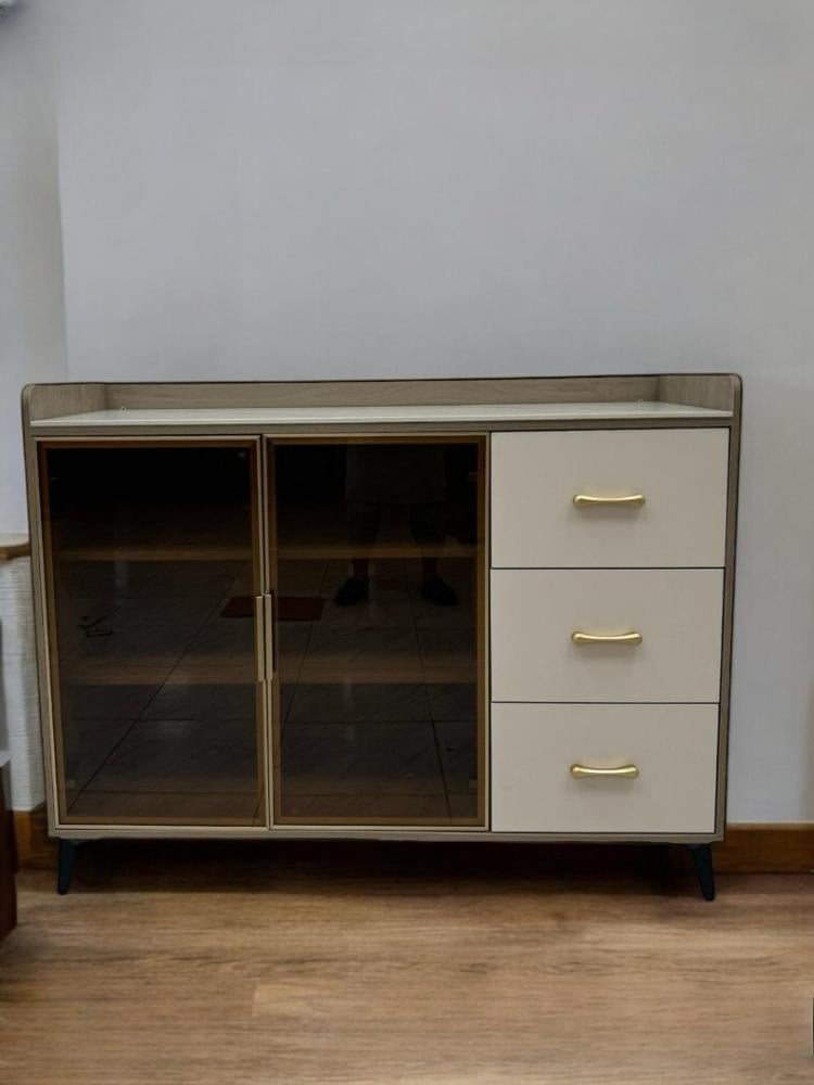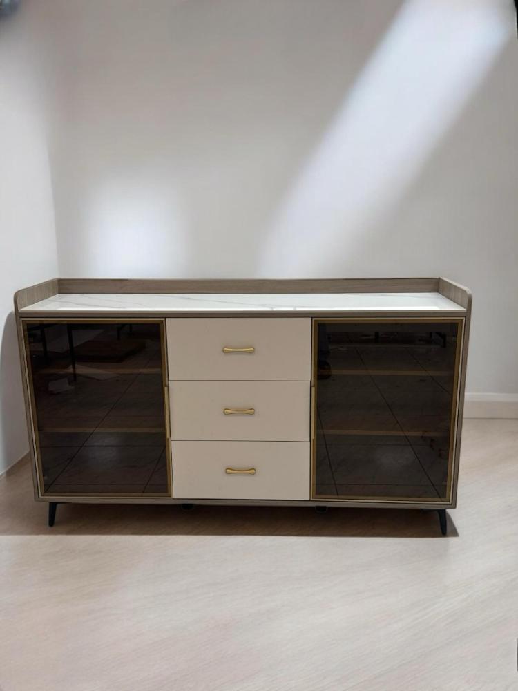 يتميز الدولاب بتصميمه المميز الذي يجمع بين خامة الخشب الأنيقة ولمسة السيراميك الرصاصي الفاتح على السطح العلوي، مما يمنحه مظهرًا فاخرًا وعصريًا. يضم الدولاب أدراجًا في المنتصف لتوفير مساحة تخزين منظمة، تحيط بها أبواب جانبية زجاجية شفافة. هذه الأبواب لا تضفي لمسة جمالية فحسب، بل تسمح لك أيضًا بعرض مقتنياتك المفضلة أو الأطباق الزجاجية الفاخرة، مما يعكس ذوقك الرفيع. المقابض الذهبية تضفي لمسة من الفخامة، بينما ترفع الأرجل المعدنية النحيفة الدولاب عن الأرض لتسهيل التنظيف وتضفي عليه مظهرًا خفيفًا.