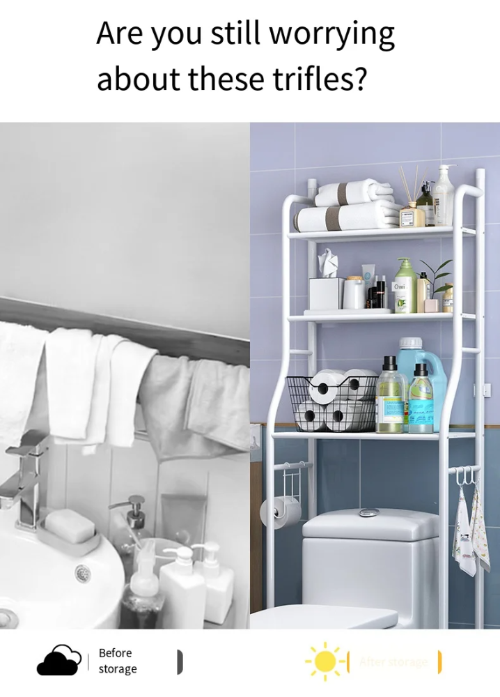 "رف تخزين عملي متعدد الاستخدامات، يوفر 3 طبقات واسعة لترتيب أدوات التنظيف أو المناشف فوق الغسالة أو المرحاض. تصميم أنيق، تثبيت قوي، مثالي لاستغلال المساحات الصغيرة بذكاء."