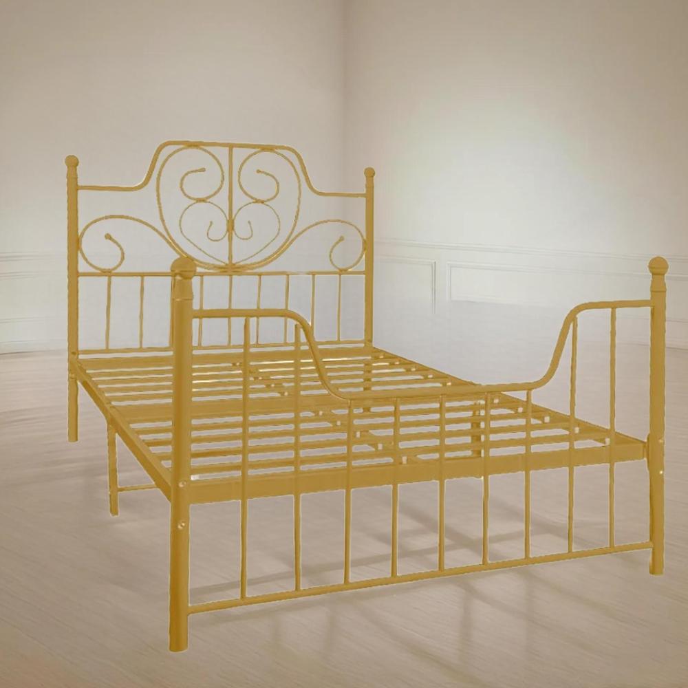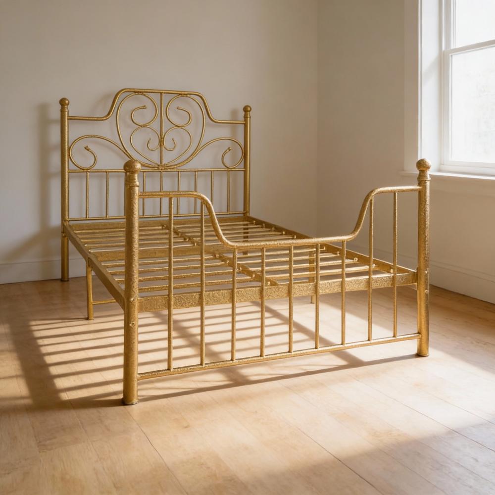 - مظهر فاخر بفضل اللون الذهبي مع التصميم المزخرف يمنحان سرير حديد ذهبي طابعًا ملكيًا.
