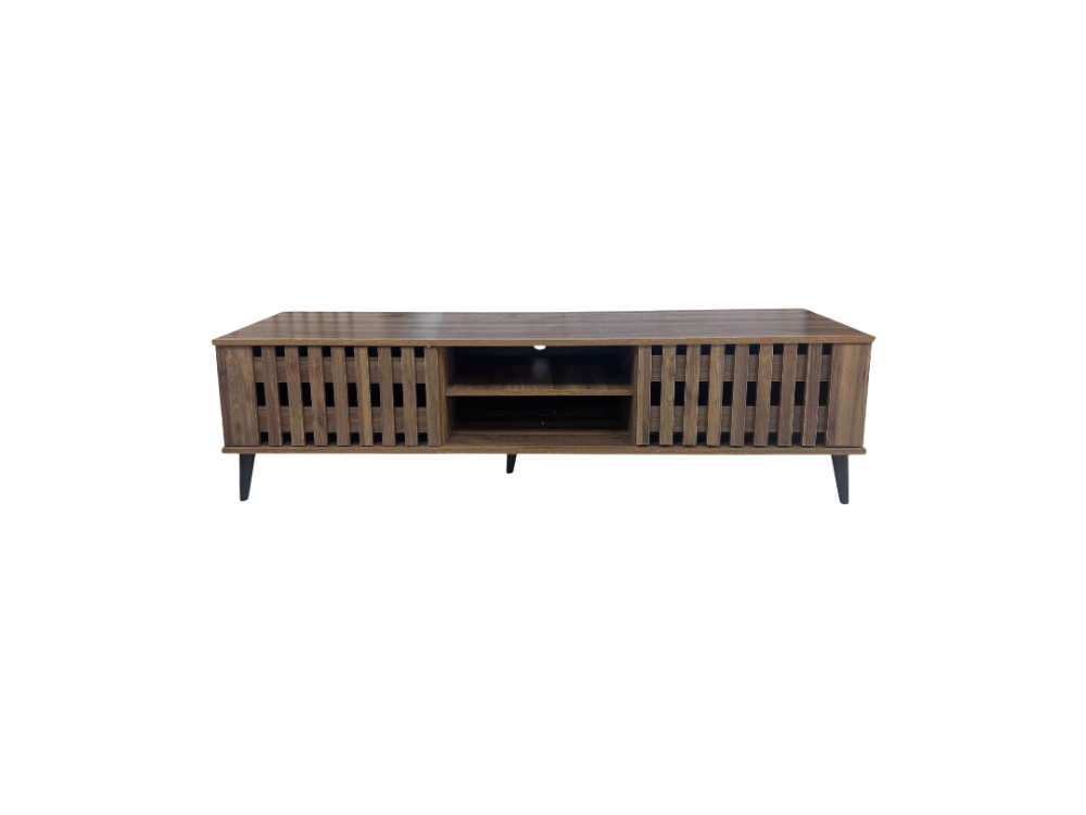 تتميز طاولة التلفاز الخشبية بتصميمها الراقي الذي يجمع بين جمال الخشب الطبيعي والتصميم الهندسي المتطور. تم صناعة هذه الطاولة من خشب عالي الجودة مع تشطيبات تحاكي ملمس ولون الخشب البنى الطبيعي بدقة عالية، مع نظام الشرائح الخشبية المميز الذي يوفر تهوية ممتازة.