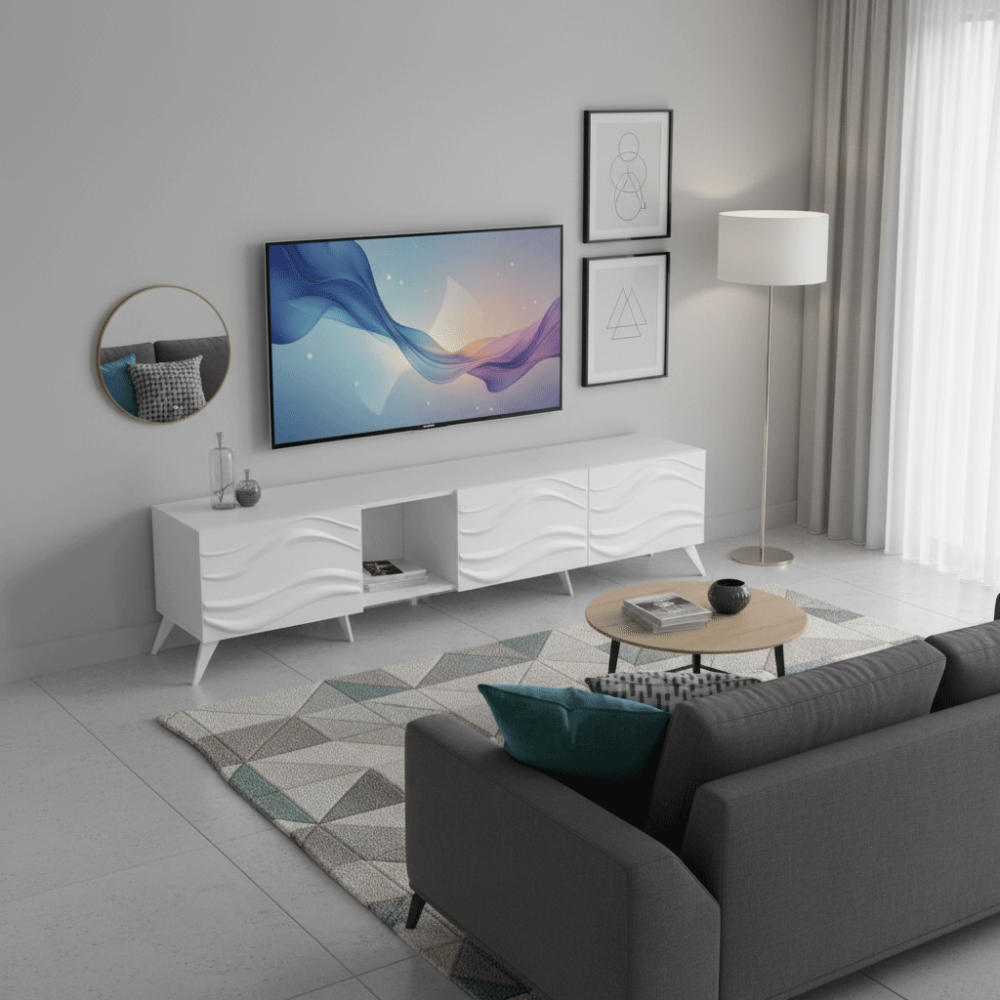 يتميز طاولة التلفزيون هذا بتصميمه العصري والملفت للنظر. فهو يجمع بين الخطوط البسيطة والنقوش المميزة، مما يضفي لمسة من الأناقة والحداثة على أي مساحة.