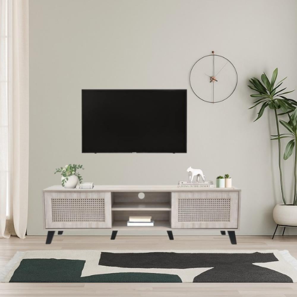 طاولة تلفاز عصرية تجمع بين الأناقة والعملية، مصممة لتكون القطعة المركزية في غرفة المعيشة الخاصة بك. تتميز بتصميم فريد يجمع بين اللون الخشبي الفاتح وشبك أنيق على الأبواب، مما يضفي لمسة جمالية راقية على ديكورك. توفر الطاولة مساحات تخزين متعددة، بما في ذلك أرفف مفتوحة للأجهزة الإلكترونية وبابين جانبيين لإخفاء الأغراض بعيدًا عن الأنظار. الأرجل الخشبية القوية باللون الأسود تضمن الثبات وتضيف لمسة عصرية للتصميم.