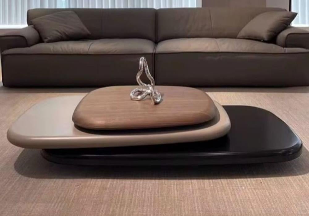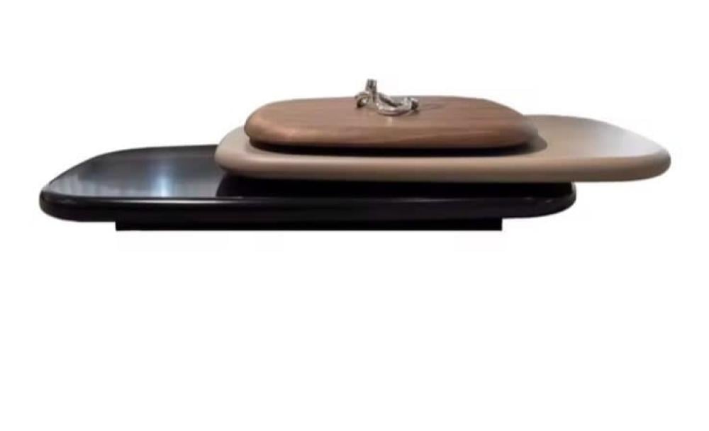 طاولة قهوة ضيافة عصرية ومبتكرة بتصميم دوار فريد يجمع بين سطحين أنيقين وعمليين. يتميز السطح السفلي بتصميم انسيابي باللون الأسود، بينما يدور فوقه سطح علوي بتصميم بيضاوي أو مشابه بلون بني خشبي دافئ . يتيح هذا التصميم الدوار سهولة الوصول إلى الضيافة من جميع الجوانب، مما يجعلها مثالية للتجمعات والمناسبات. تجمع هذه الطاولة بين الأناقة العصرية والوظيفة العملية، وتضيف لمسة مميزة إلى غرفة المعيشة أو منطقة الاستقبال.