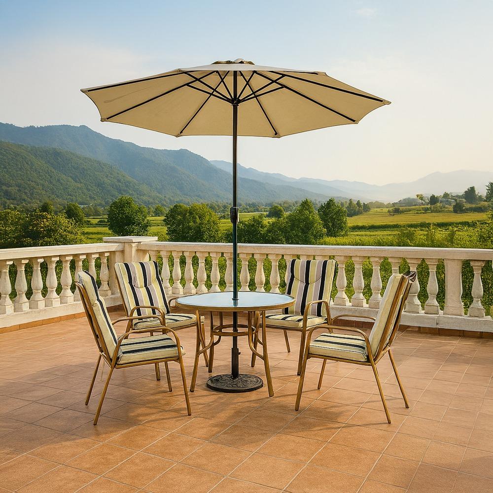 - الوظائف: توفر المظلة حماية من الشمس والأمطار، مما يسمح بالاستمتاع بالجلسة في أي وقت من اليوم.