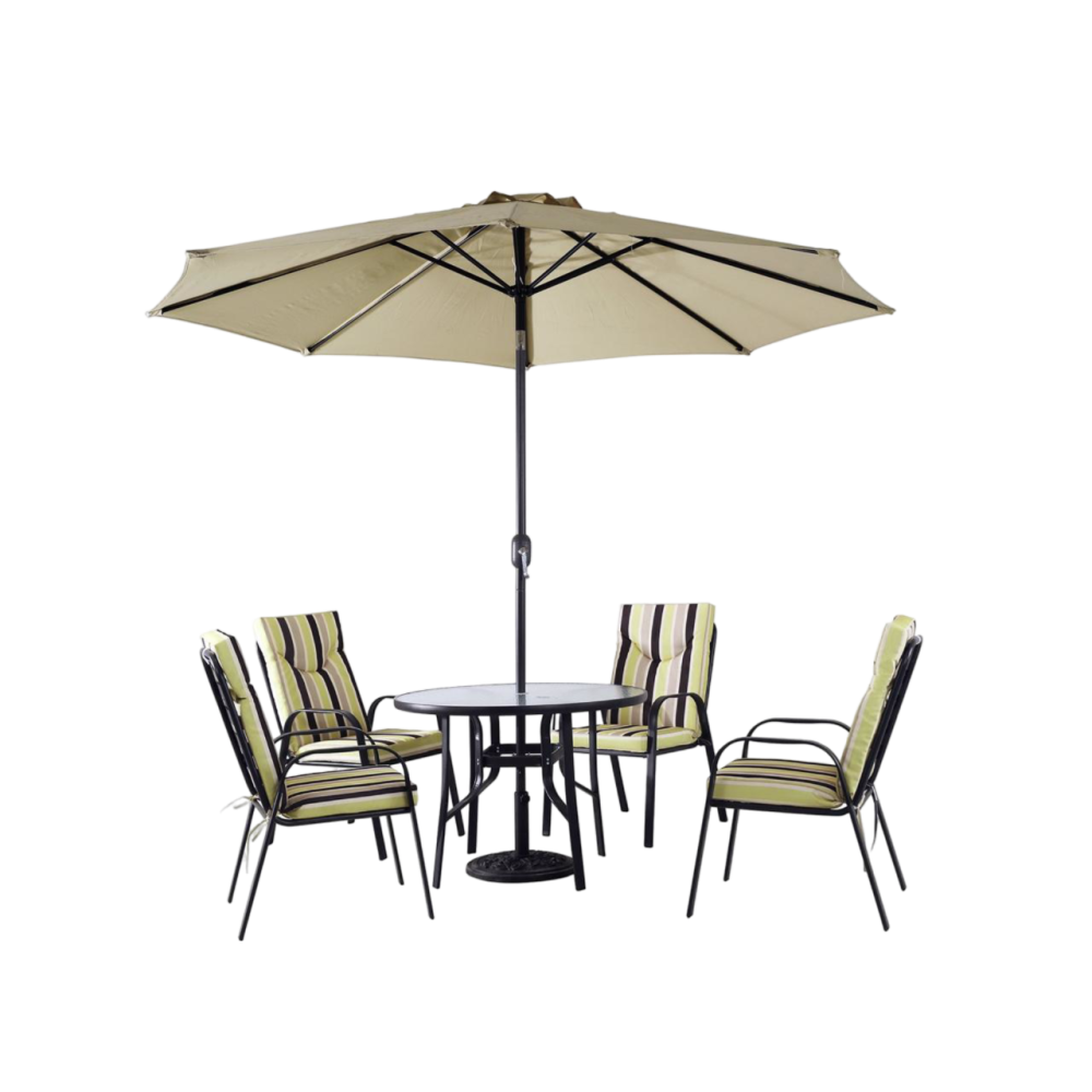 طاولة طعام خارجية مع 4 كراسي ومظلة.