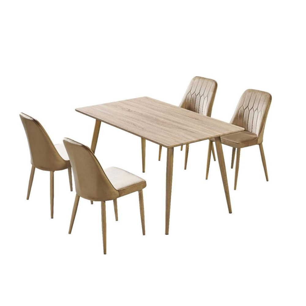 طاولة طعام صغيرة خشبية من ديكورا – طاولة طعام صغيرة بتصميم عصري لـ4 أشخاص. سطح خشبي بلون بيج مع قاعدة معدنية، متوفرة الآن من متجر ديكورا.