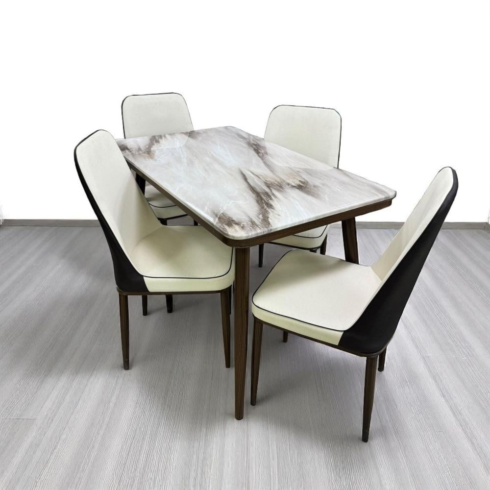 طاولة طعام مودرن بإطار معدني وسطح خشبي أنيق