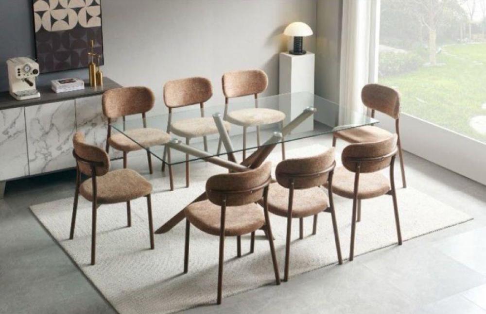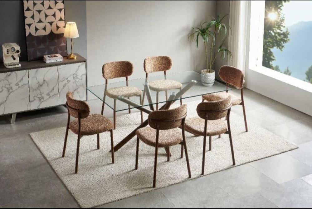 طقم طاولة طعام زجاجية بتصميم عصري يجمع بين جمال المواد الطبيعية وشفافية الزجاج. يتميز هذا الطقم بسطح طاولة زجاجي مستطيل شفاف يمنح إحساساً بالاتساع والنور، وقاعدة خشبية متينة بتصميم متشابك بلون بني دافئ. تكتمل أناقة الطقم بكراسي منجدة بقماش ناعم بلون بني فاتح متناسق مع القاعدة، ومصممة بأرجل خشبية قوية توفر الراحة والأناقة في آن واحد.