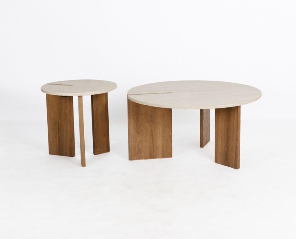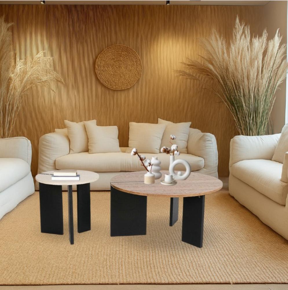 طاولة قهوة عصرية بتصميم فريد ومبتكر، تأتي في طقم مكون من قطعتين، كبيرة وصغيرة، مما يوفر مرونة في الاستخدام والديكور. يتميز السطح بتصميم أنيق يجمع بين الخشب و الرخام، مع خط فاصل يضيف لمسة فنية. الأرجل السميكة المصنوعة من الخشب أو المعدن الأسود تمنح الطاولة ثباتاً عالياً وتصميماً جذاباً.