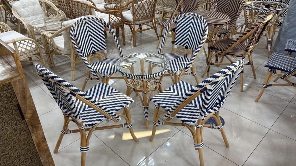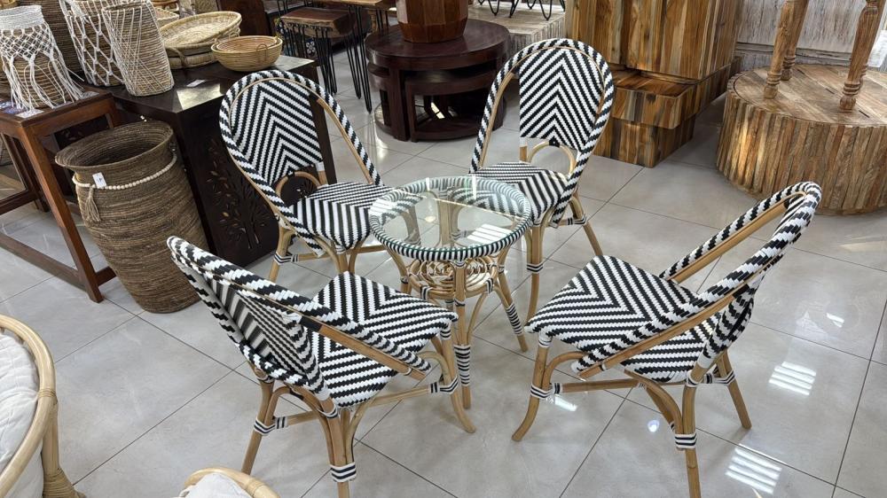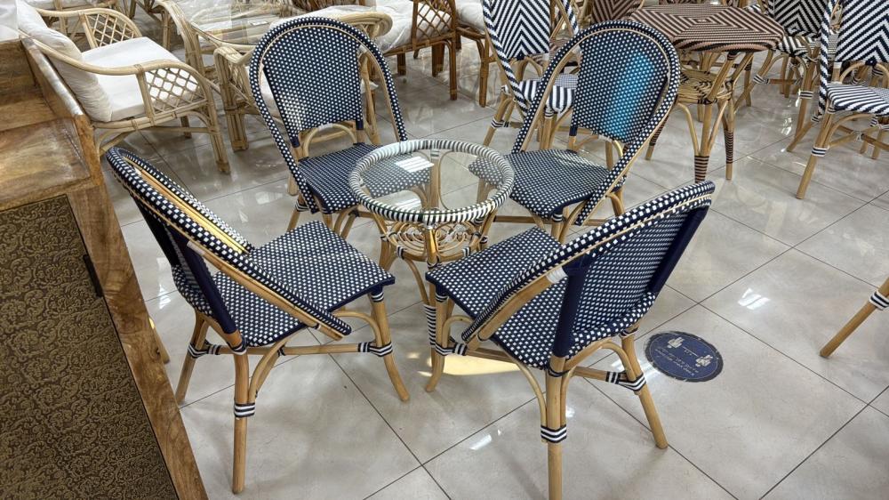 هذا الطقم الأنيق هو مزيج مثالي من الجمال الطبيعي والتصميم العصري، يتكون من 4 كراسي وطاولة صغيرة. صُنع الهيكل من الخيزران الطبيعي، وهو مادة متينة وقوية تمنح القطع مظهرًا دافئًا وجذابًا. أما المقاعد والظهر، فقد تم نسجها يدويًا من الراتان الصناعي، الذي يتميز بمرونته ومقاومته للعوامل الجوية. يتوفر الطقم بتصاميم مختلفة، تشمل الأنماط الهندسية الجذابة باللونين الأبيض والأسود، وكذلك اللون الأزرق الداكن بنقاط بيضاء، واللون الأسود والبني بنقوش ماسية. تأتي الطاولة بسطح زجاجي شفاف يبرز جمال النسيج السفلي ويضفي لمسة من الرقي والأناقة.