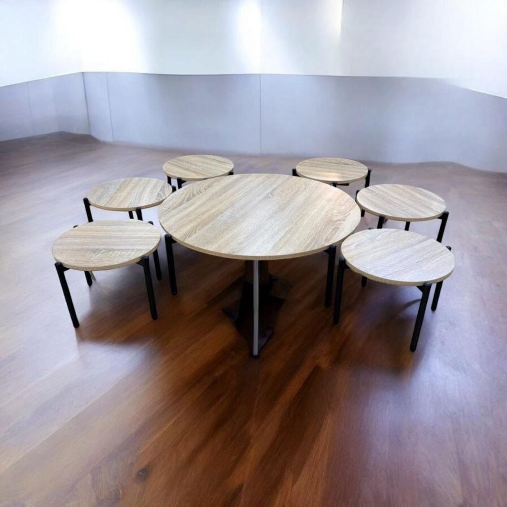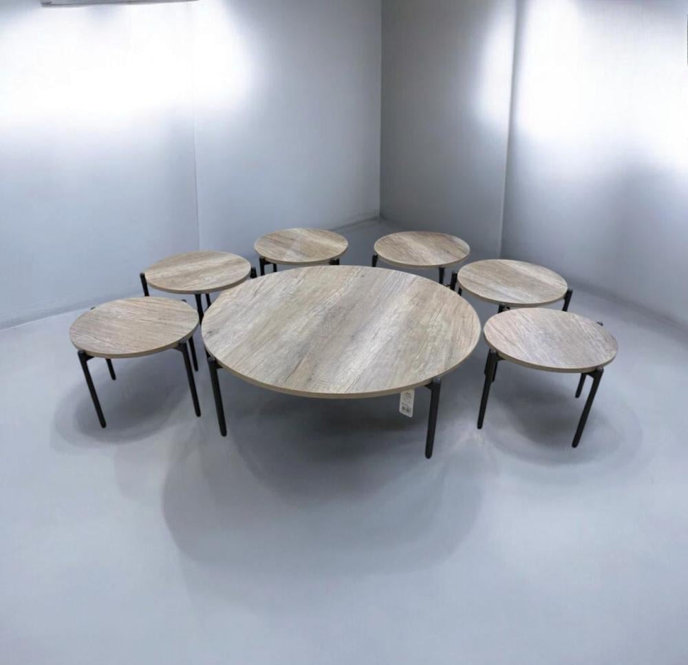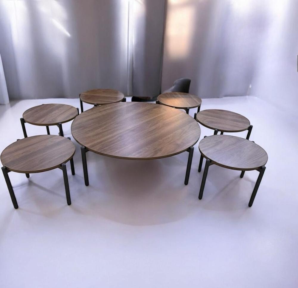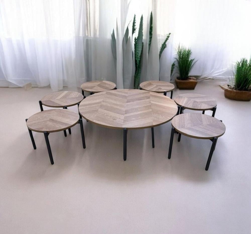 طقم طاولات أرضي مكون من 6 طاولات جانبية مع طاولة رئيسية دائرية بتصميم راقٍ يضفي لمسة من الفخامة والدفء على أي مساحة. مصمم ليجمع بين الأناقة والوظائف العملية، حيث يمكن استخدام الطاولات الصغيرة بشكل منفصل أو دمجها حول الطاولة الرئيسية لمظهر متناسق وجذاب.