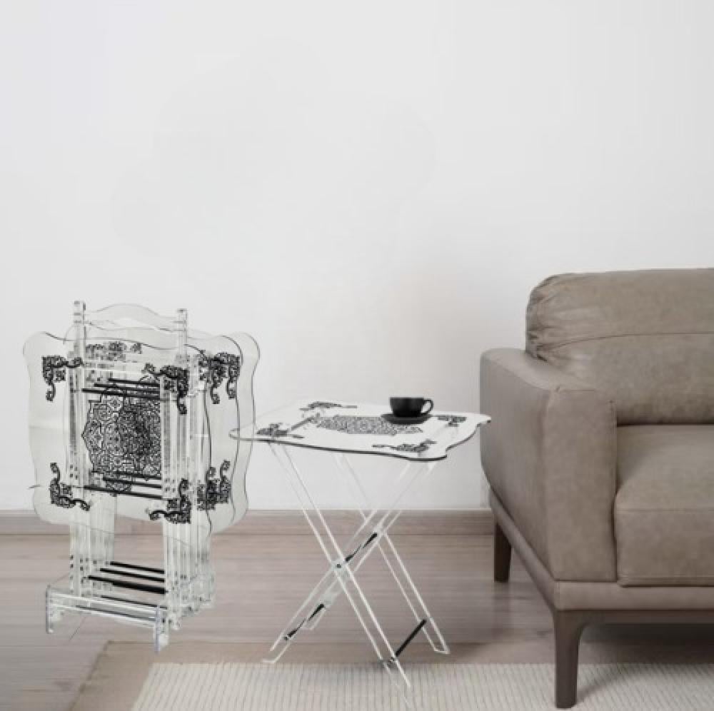4. طقم طاولات أكريليك شفاف بنقوش سوداء أنيقة.