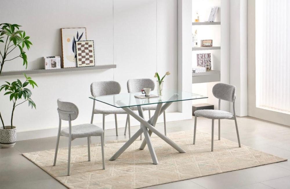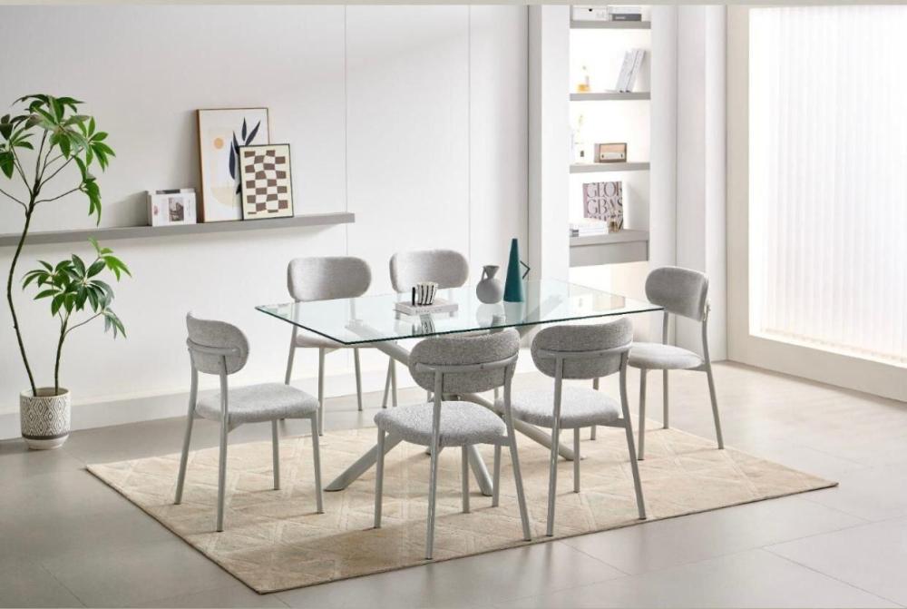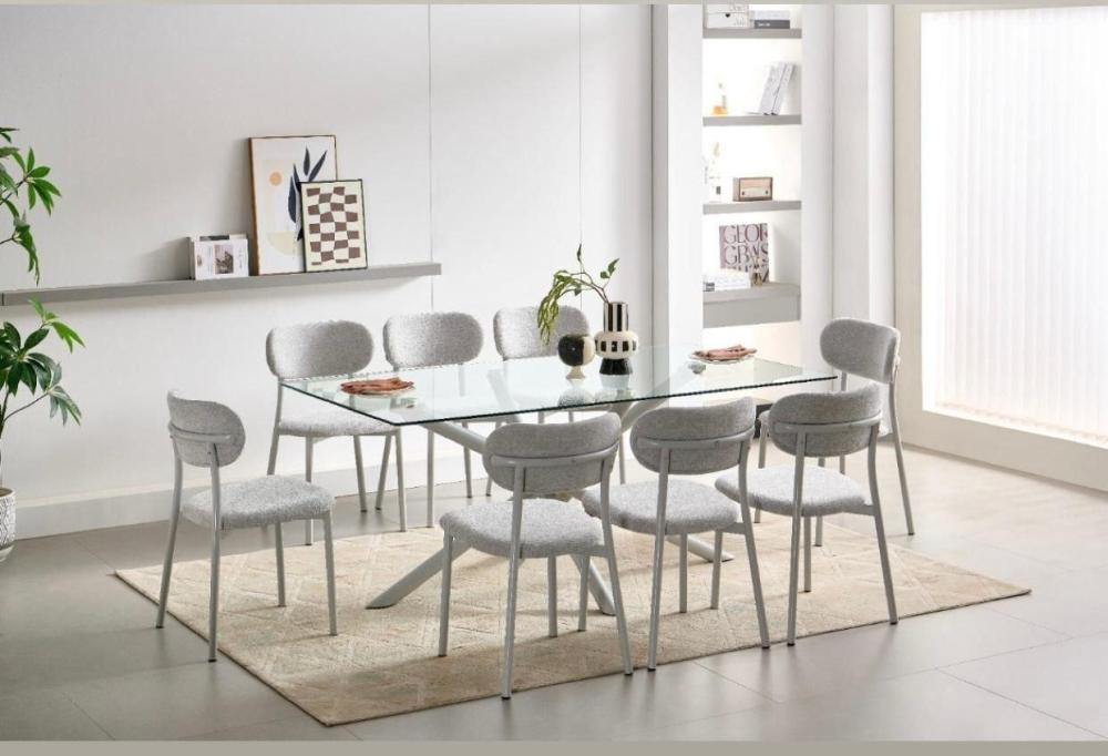 طقم طاولة طعام زجاجية بتصميم عصري وأنيق، يجمع بين جمال المواد الطبيعية وشفافية الزجاج. يتميز هذا الطقم بسطح طاولة زجاجي مستطيل شفاف يمنح إحساساً بالاتساع والنور، وقاعدة معدنية متينة بتصميم متشابك بلون رصاصي فاتح أنيق. تكتمل أناقة الطقم بكراسي منجدة بقماش ناعم بلون رصاصي فاتح متناسق مع الطاولة، ومصممة بأرجل معدنية رفيعة وقوية توفر الراحة والأناقة في آن واحد.