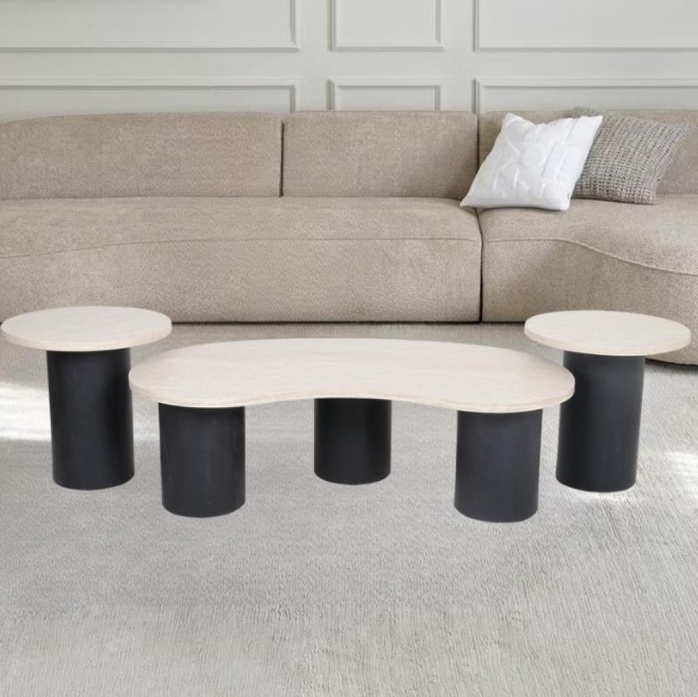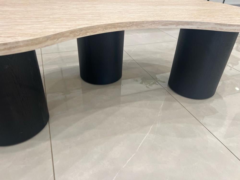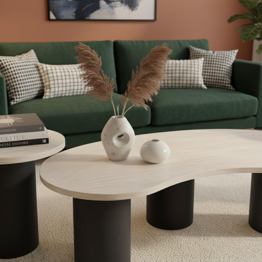 طاولة كبيرة: شكل غير منتظم يشبه التصاميم العضوية، بسطح علوي بلون خشبي فاتح وأرجل أسطوانية سوداء تعكس تبايناً جمالياً.