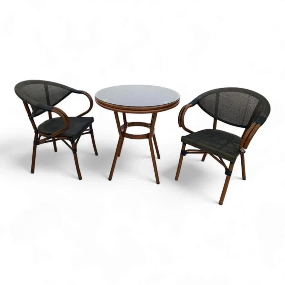 بالطبع، طقم طاولة وكرسيين مصنوع من الخيزران والإطار المعدني لمقاومة الشمس والرطوبة.