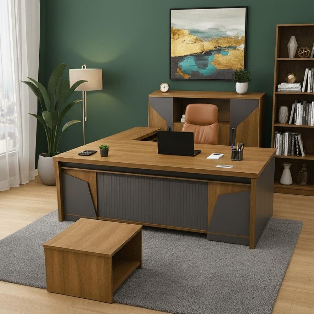 طقم مكتب عصري وأنيق ليضفي لمسة احترافية وراقية على أي مساحة عمل. يتكون الطقم من مكتب رئيسي واسع يوفر سطحًا كبيرًا لإنجاز المهام وتنظيم المستلزمات، وملحق جانبي عملي يوفر مساحة إضافية أو سطحًا ثانويًا للعمل أو الاجتماعات المصغرة، بالإضافة إلى دولاب تخزين أنيق بأبواب وأرفف لتنظيم الملفات والأوراق والأدوات المكتبية بكفاءة. يتميز الطقم بتصميم عصري وألوان خشبية دافئة مع لمسات رمادية أنيقة، مما يجعله يتناسب مع مختلف أنماط الديكور المكتبي. صُنع هذا الطقم من خامات عالية الجودة تضمن المتانة والاستدامة على المدى الطويل.