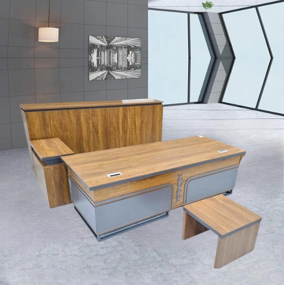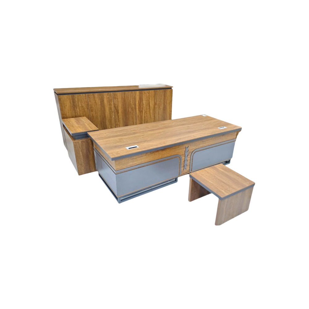 طقم مكتب عصري مصمم لتلبية احتياجات مساحة عمل منظمة وفعالة. يتميز المكتب بسطح مستطيل واسع من الخشب عالي الجودة، مما يوفر مساحة عمل مريحة لإنجاز مهامك. يأتي المكتب مزودًا بوحدة جانبية ملحقة توفر مساحة تخزين إضافية للأوراق والملفات والأدوات المكتبية، مما يساعد في الحفاظ على سطح المكتب مرتبًا. يكتمل الطقم بدولاب تخزين علوي أنيق ومتناسق مع تصميم المكتب، مما يوفر مساحة رأسية إضافية للتنظيم. بالإضافة إلى ذلك، يتضمن الطقم مقعدًا عمليًا بتصميم بسيط وعصري. يتميز التصميم العام للطقم بخطوط نظيفة وألوان محايدة تضفي عليه مظهرًا احترافيًا وعصريًا يتناسب مع مختلف الديكورات.