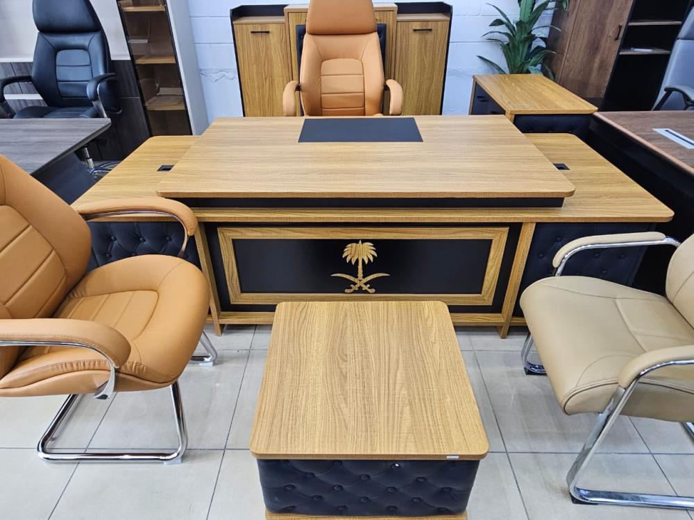 كما يشمل الطقم طاولة اجتماعات صغيرة تتماشى مع التصميم العام، إلى جانب وحدة أدراج جانبية تسهل حفظ الملفات والاحتياجات اليومية. الكراسي المصاحبة مريحة بتصميم عصري مع إطار معدني متين، مما يوفر تجربة جلوس مريحة لفترات طويلة.