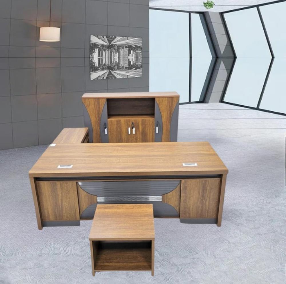 طقم مكتب تنفيذي فاخر يجمع بين التصميم الأنيق والوظائف العملية المتعددة. يتميز المكتب بسطح عريض من الخشب عالي الجودة بتشطيب أنيق، مما يوفر مساحة عمل واسعة ومريحة. يأتي المكتب مزودًا بوحدة جانبية ملحقة تتضمن أدراجًا ووحدات تخزين مغلقة لتنظيم الملفات والأوراق واللوازم المكتبية بكفاءة. يكتمل الطقم بدولاب تخزين علوي أنيق ومتناسق، يوفر مساحة إضافية لتخزين الكتب والمجلدات وعرض التحف أو الديكورات المكتبية. كما يتضمن الطقم مقعدًا مربعًا مريحًا يتماشى مع تصميم المكتب. يتميز التصميم العام للطقم بلمسات عصرية وألوان متناسقة تضفي على المكتب مظهرًا احترافيًا وراقيًا، مما يجعله إضافة مثالية لأي مكتب تنفيذي أو منزلي يسعى للأناقة والعملية.