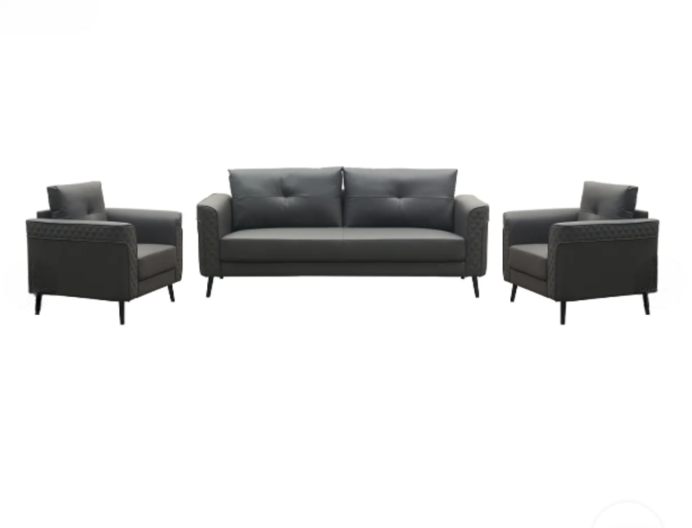 يتميز هذا الطقم المكتبي الأنيق بتصميم عصري وخطوط واضحة، يضم كنبة مريحة بثلاثة مقاعد وكرسيًا فرديًا متناسقًا باللون الرمادي الداكن. يوفر المقعد والظهر المبطنان راحة ودعمًا ممتازين، بينما تضفي مساند الأذرع العريضة والتفاصيل الأنيقة لمسة بصرية مميزة. يرتكز الطقم على أرجل معدنية سوداء رفيعة تمنحه مظهراً عصرياً وأنيقاً، مما يجعله إضافة مثالية لمساحات الاستقبال أو المكاتب التي تسعى إلى الجمع بين الراحة والاحترافية.
