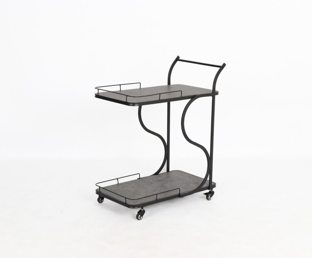 عربة تقديم عصرية وأنيقة بتصميم عملي مكون من طابقين، تجمع بين الأناقة والوظيفية لتلبي احتياجاتك المتنوعة في المنزل أو العمل. تتميز بإطار معدني أسود قوي مع أرفف خشبية واسعة توفر مساحة تخزين وتقديم ممتازة.