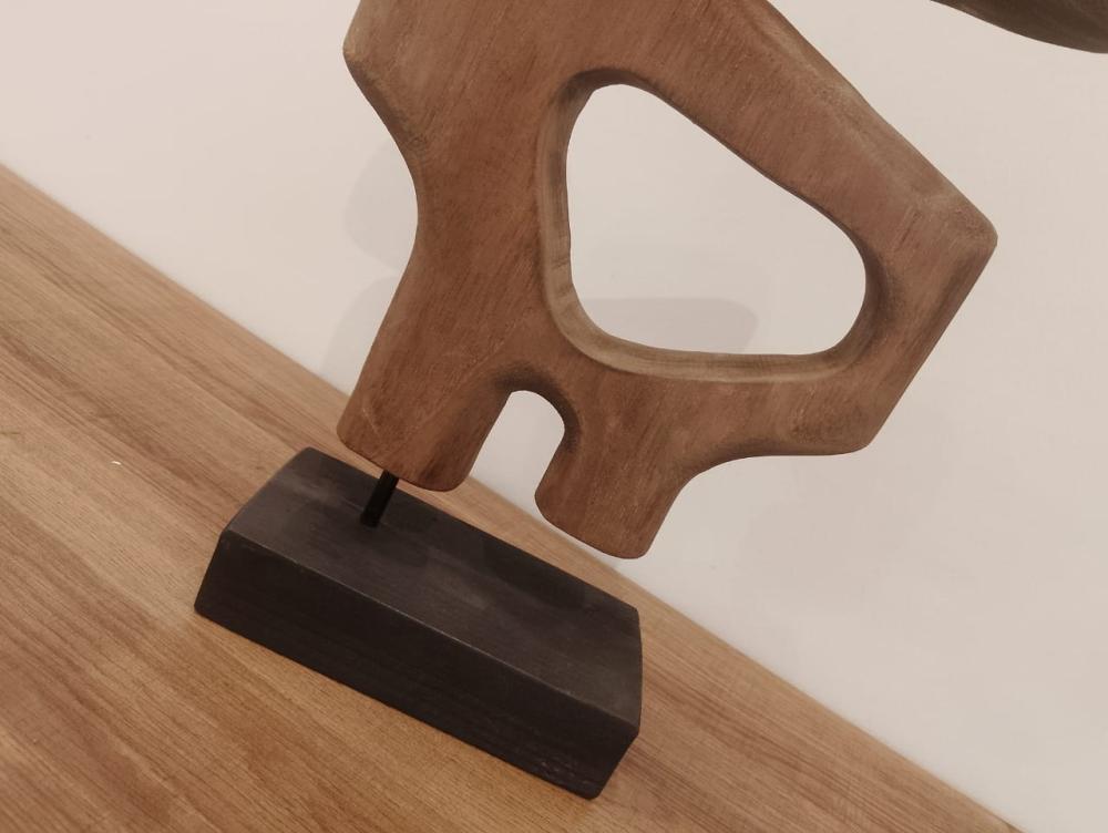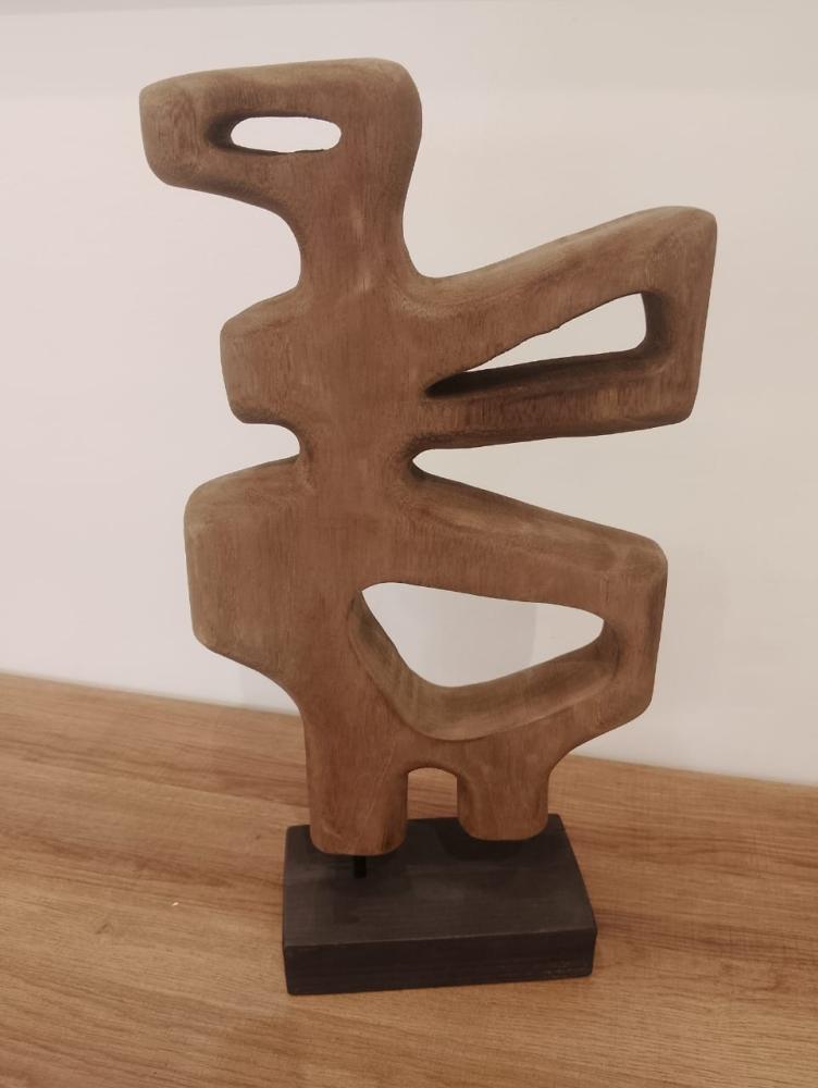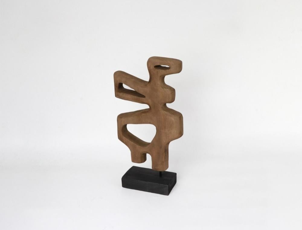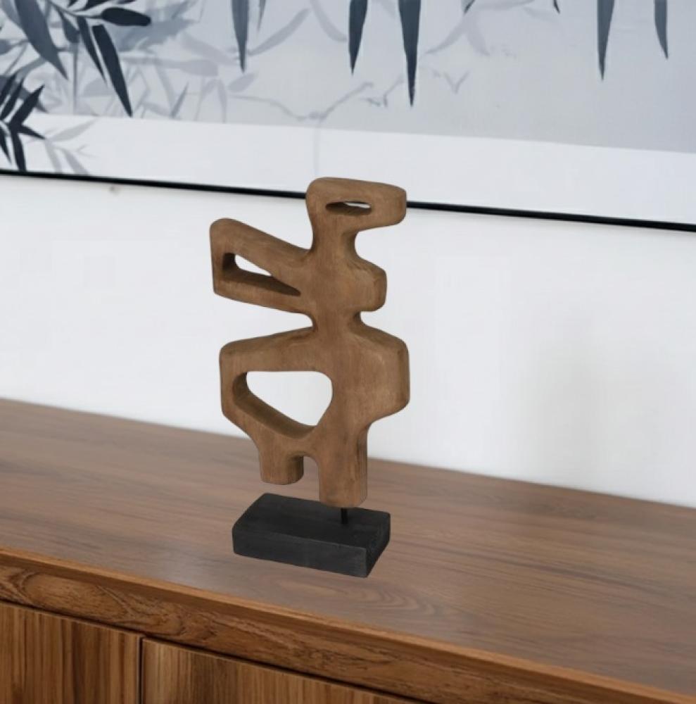قطعة ديكور خشبية فنية بتصميم تجريدي معاصر، تتميز بأشكال هندسية متداخلة ومتموجة تخلق تكويناً فنياً مبهراً. مصنوعة من الخشب الطبيعي المصقول ومثبتة على قاعدة معدنية سوداء أنيقة. تجمع بين الحرفية التقليدية والفن المعاصر في قطعة واحدة مميزة، متوفرة بلونين: الجوز الطبيعي والأسود الكامل.