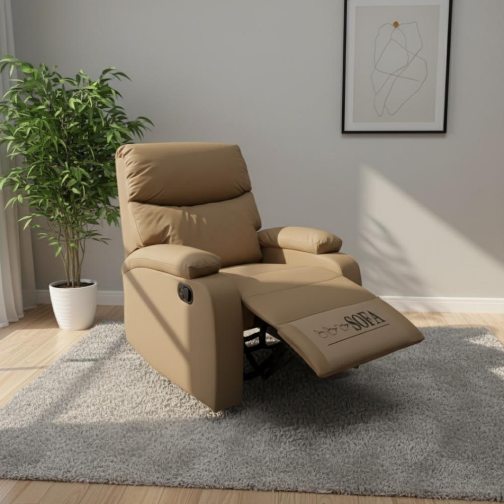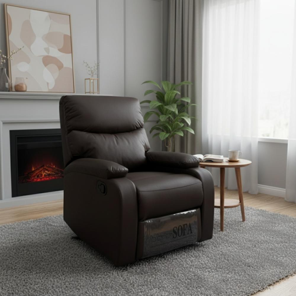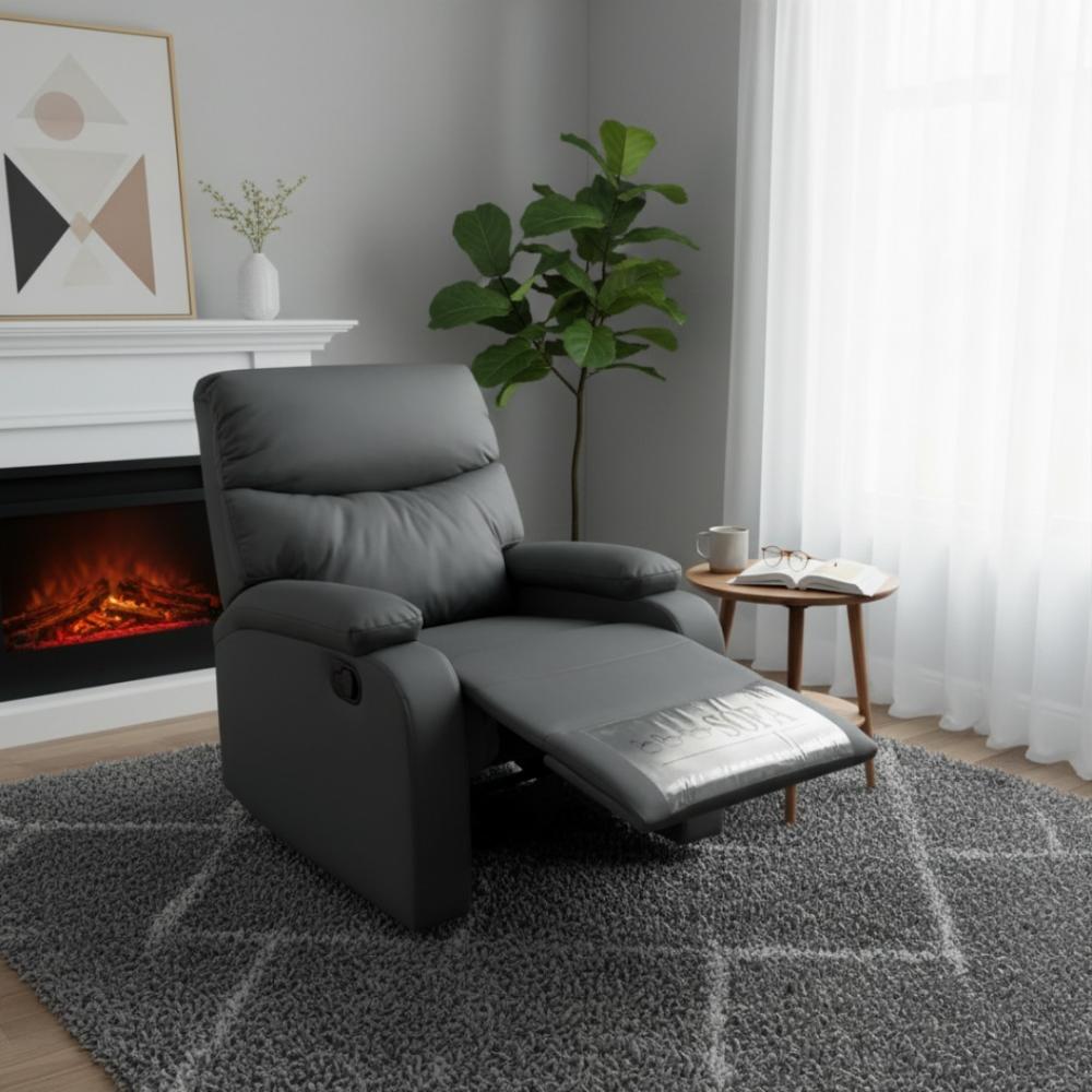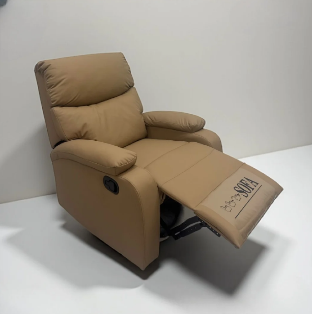 كرسي استرخاء فاخر ومريح بتصميم عصري متوفر بأربعة ألوان أنيقة هي الرمادي الداكن والبني الغامق والبيج الفاتح والكاكي، مصنوع من جلد صناعي عالي الجودة ناعم الملمس وسهل التنظيف مع تبطين كامل بإسفنج عالي الكثافة يوفر راحة استثنائية، يتميز بنظام ريكلاينر يدوي سهل الاستخدام بمقبض جانبي يتيح التحكم بزوايا مسند الظهر القابل للاستلقاء ومسند قدمين قابل للفرد والطي يوفر راحة كاملة للساقين، مع مساند ذراعين عريضة ومبطنة بشكل فاخر ووسادة رأس مريحة توفر دعماً ممتازاً للرقبة