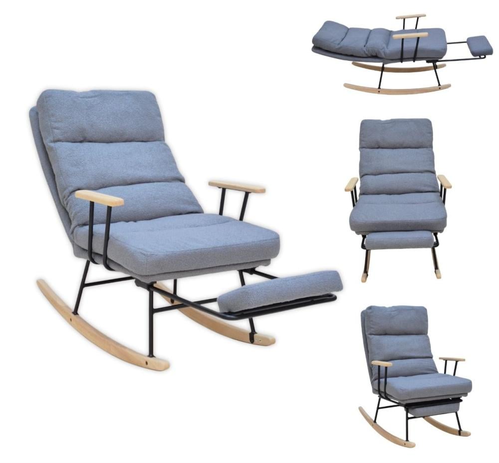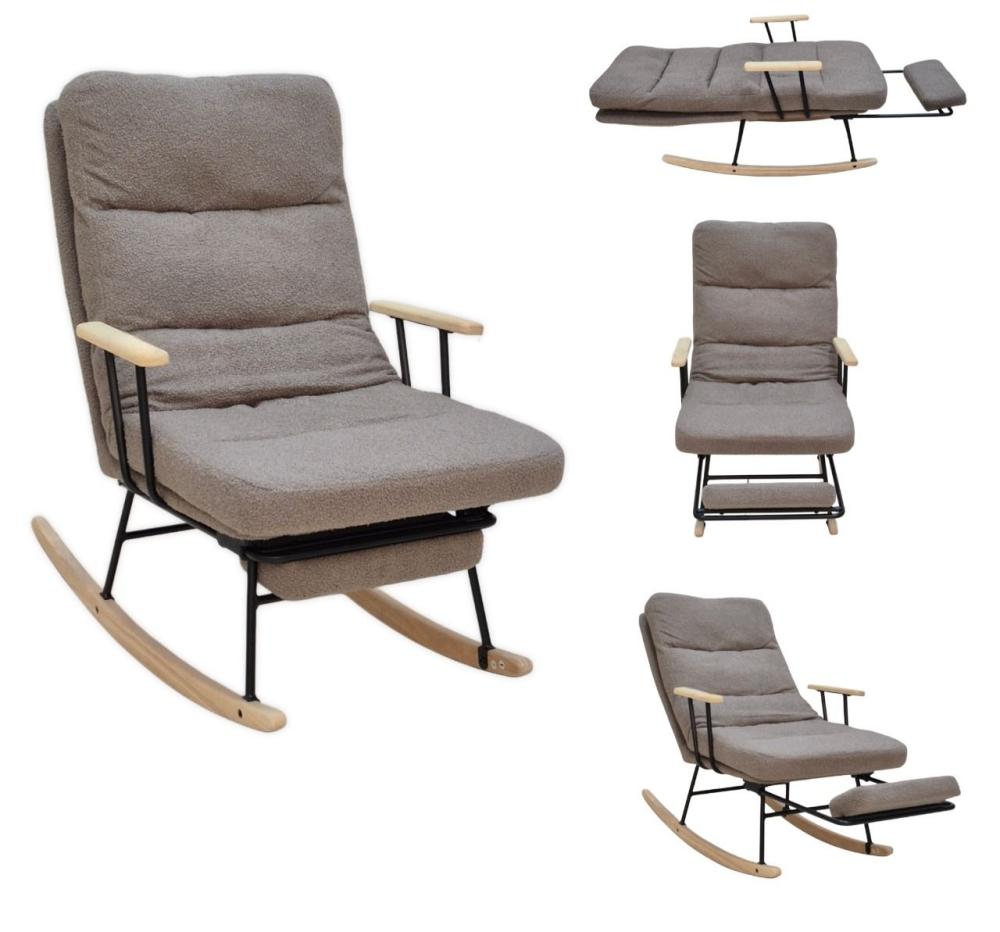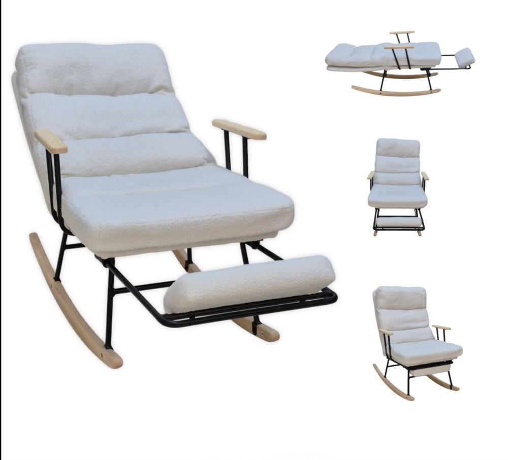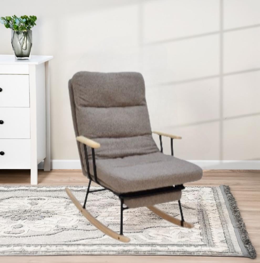 يتميز الكرسي بمسند ظهر مبطن ومسند قدم قابل للتعديل، مما يسمح لك باختيار الوضعية الأكثر راحة لك، سواء كنت تفضل الجلوس بشكل مستقيم أو الاستلقاء شبه الكامل. القاعدة الخشبية المنحنية تضمن حركة هزازة سلسة وهادئة، بينما الهيكل المعدني المتين يوفر الاستقرار والدعم.