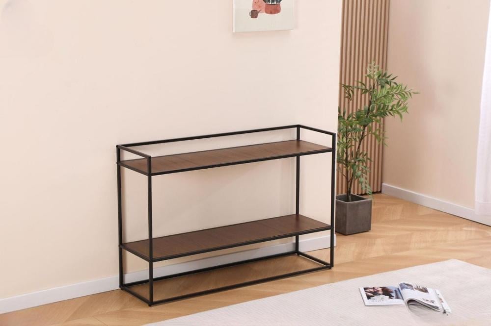 طاولة مدخل عصرية بتصميم صناعي مينيمال يجمع بين البساطة والأناقة، تتميز بإطار معدني أسود أنيق وثلاثة أرفف واسعة بحواف منحنية مميزة تضيف لمسة جمالية فريدة.