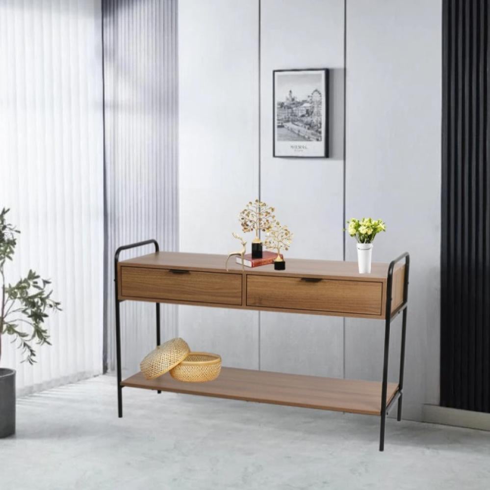 يتميز الكونسول بسطح علوي واسع بطول 120 سم يوفر مساحة مثالية لعرض التحف الفنية، الزهور، أو وضع المفاتيح والأغراض اليومية. يضم الكونسول درجين واسعين بتصميم خشبي طبيعي، مع مقابض سوداء أنيقة، مما يوفر حلاً عمليًا لتخزين وتنظيم الأغراض الصغيرة بعيدًا عن الأنظار. أسفل الأدراج، يوجد رف سفلي مفتوح يوفر مساحة إضافية لتخزين السلال، الأحذية، أو عرض الكتب والديكورات.