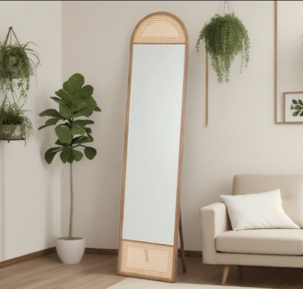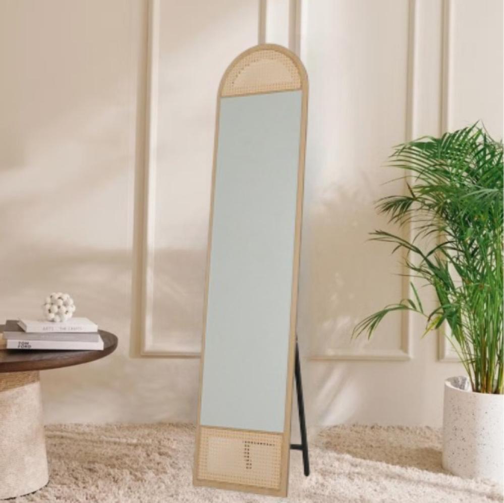 تُقدم لك هذه المرآة الطويلة حلاً مثالياً لإكمال ديكور منزلك وإضافة عمق بصري وجاذبية فورية. بتصميمها الفريد الذي يجمع بين الإطار الخشبي الدافئ وشكلها المستطيل الذي ينتهي بقوس علوي ناعم، تتناغم هذه المرآة بسلاسة مع مختلف الأنماط الديكورية، . تتميز بقاعدة خلفية متينة تسمح لها بالوقوف بثبات على الأرض دون الحاجة للتركيب، مما يمنحك مرونة في تغيير مكانها بسهولة. الجزء السفلي والعلوي من الإطار مزين بتفاصيل من خامة المنسوجة بعناية، مما يضفي لمسة فنية فريدة ولمسة من الطبيعة الدافئة. هذه المرآة ليست مجرد أداة لتعكس صورتك، بل هي قطعة فنية تعزز من إشراق الغرفة وتجعلها تبدو أكبر وأكثر فخامة.