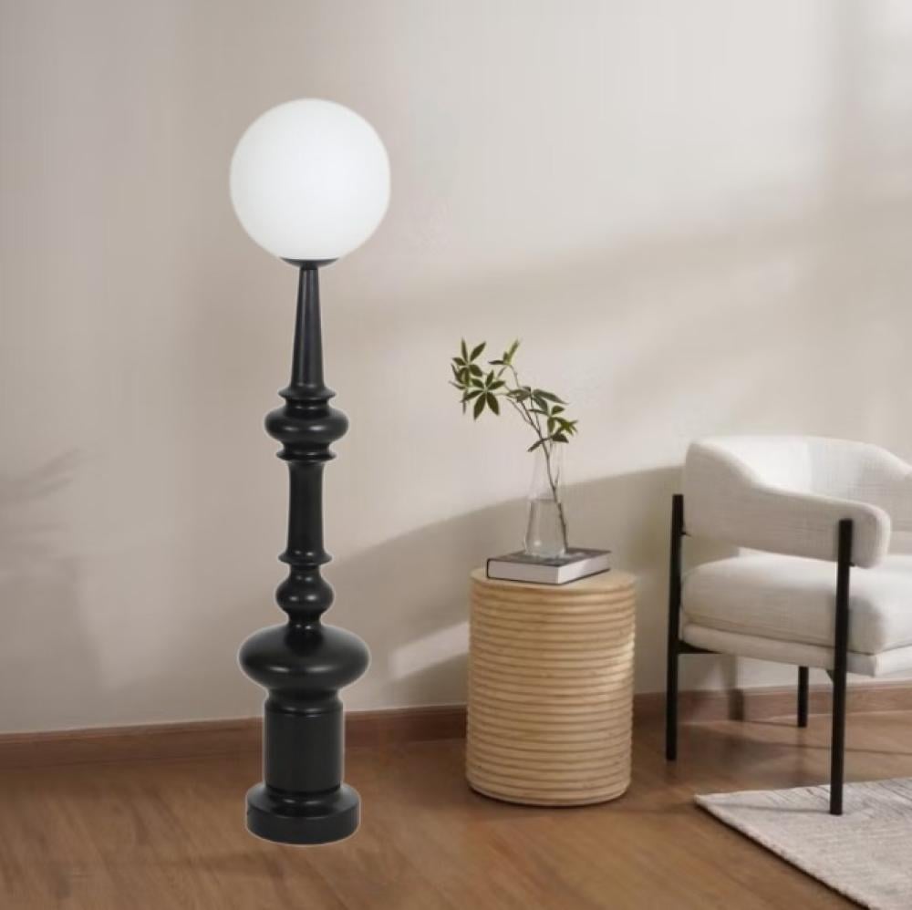 احصل على مصباح أرضي مودرن من ديكورا. تصميم أنيق بقاعدة سوداء ومصباح كروي أبيض، إضاءة ناعمة ومريحة تناسب غرف المعيشة والنوم، جودة عالية ولمسة فخمة لكل ركن في المنزل.