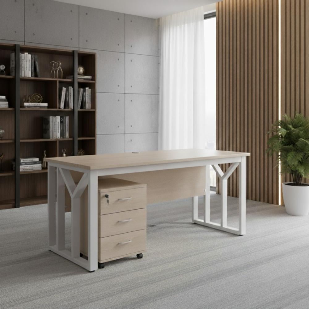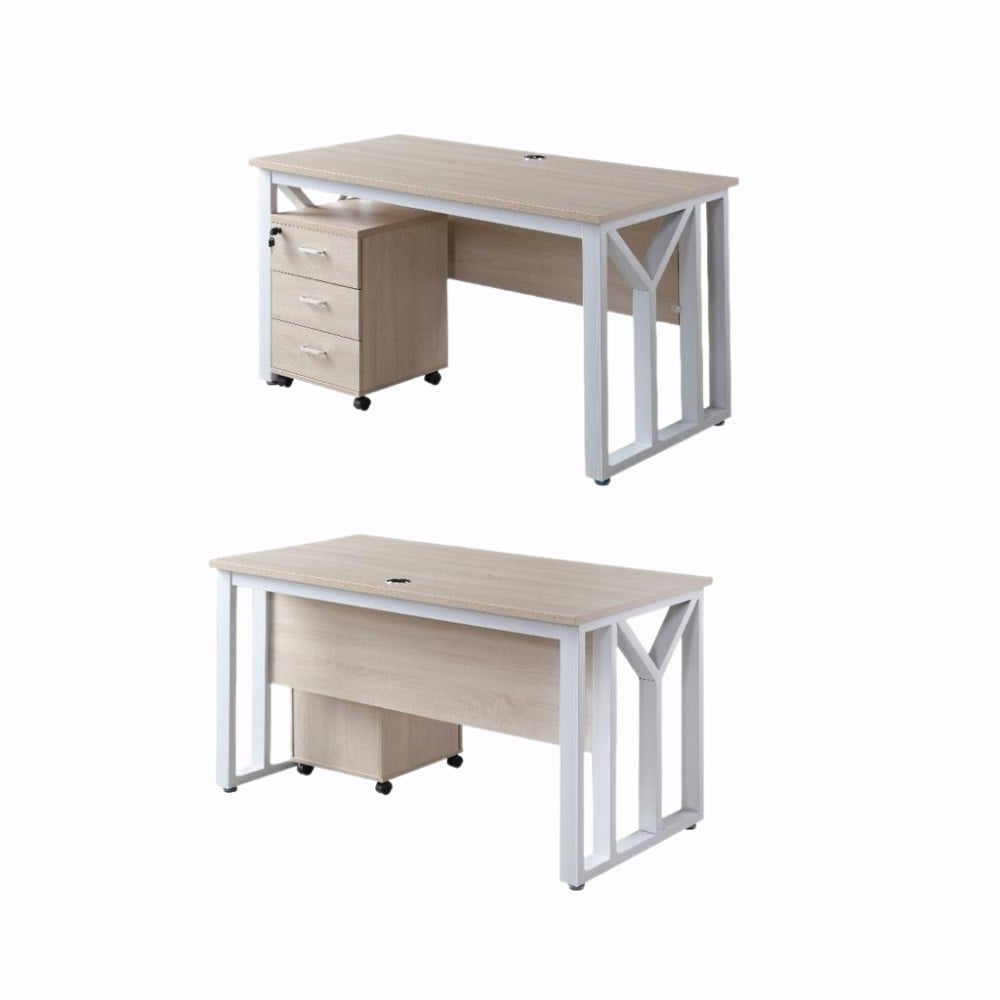 الوظائف: يوفر هذا المكتب مساحة عمل واسعة وكافية لوضع الكمبيوتر المحمول أو المكتبي، والوثائق، والأدوات المكتبية الأخرى. كما يأتي مزودًا بدُرج متحرك بثلاثة أدراج لتخزين الأوراق والأقلام والأدوات الصغيرة الأخرى.