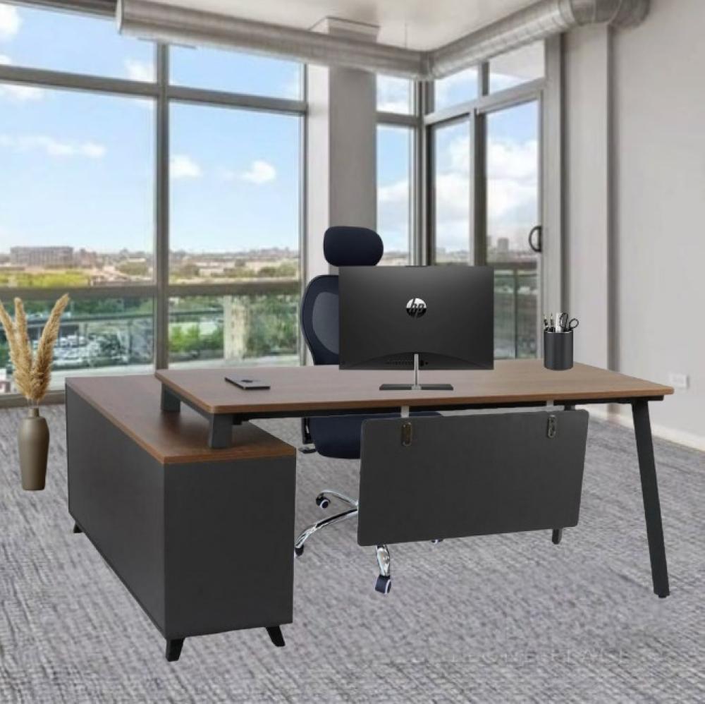 يتميز المكتب بتشطيب خشبي أنيق وجميل، يعطيه مظهرًا دافئًا وطبيعيًا. يتميز أيضًا مما يضيف لمسة من الألوان والحيوية إلى التصميم.
