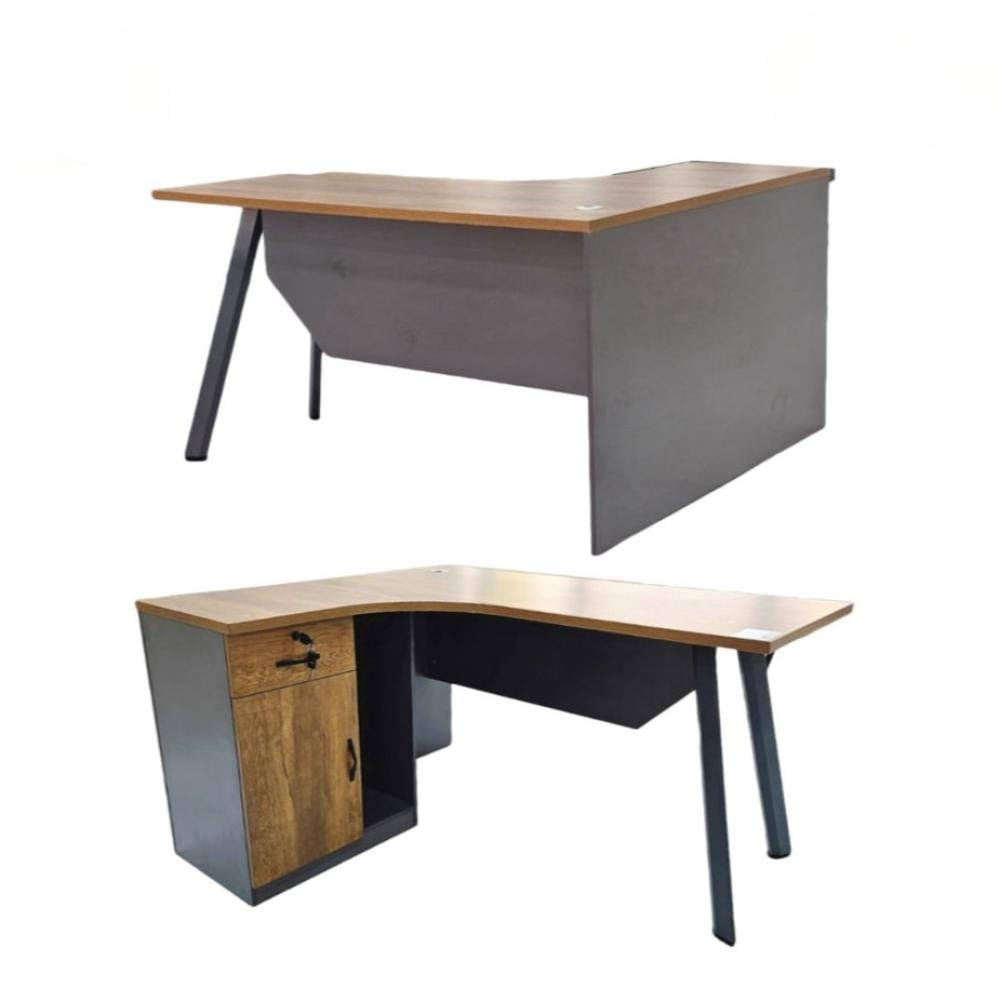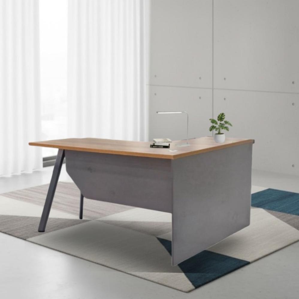 يتميز هذا المكتب العصري بتصميمه الأنيق والعملي الذي يجمع بين الجمال والوظائف المتعددة. يأتي المكتب بسطح خشبي فاخر بلون طبيعي دافئ، مع قاعدة رمادية أنيقة وأرجل معدنية سوداء تضفي لمسة عصرية مميزة.