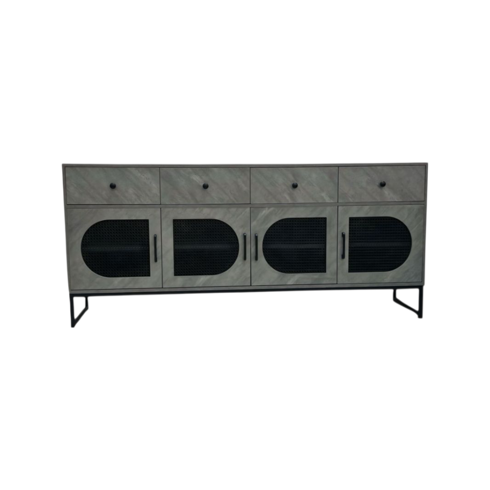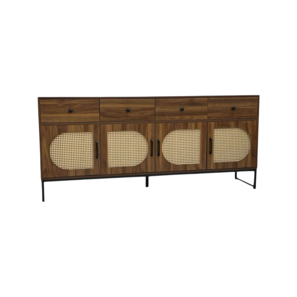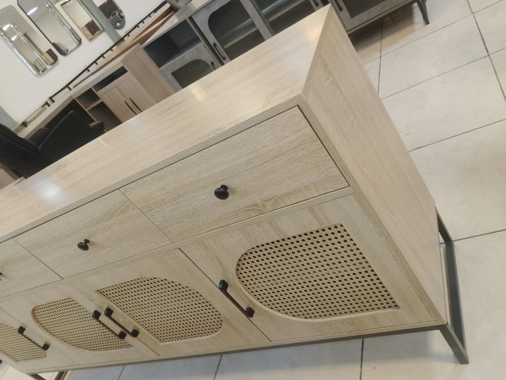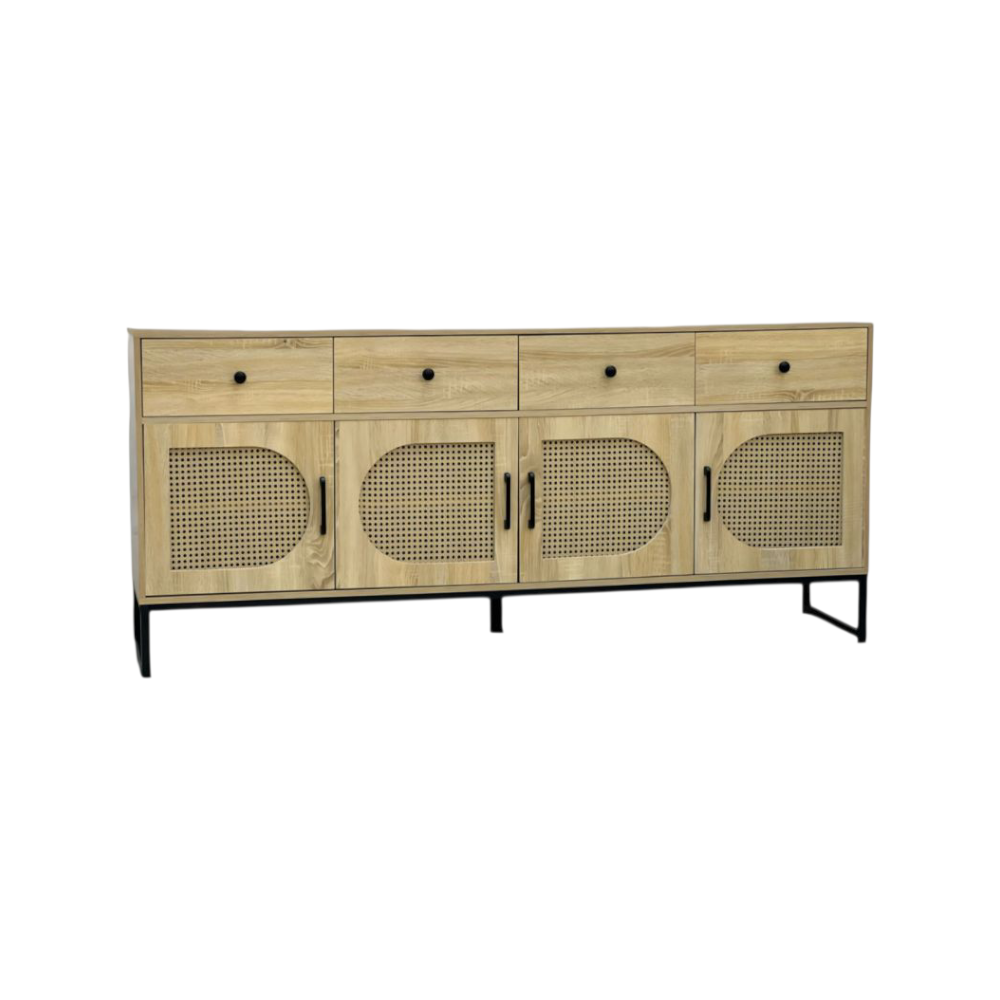 يحتوي هذا البوفيه على أربعة أبواب بتصميم شبكي عصري يضفي لمسة أنيقة ويمنح تهوية مثالية لمحتوياته، إلى جانب أربعة أدراج علوية تساعد في تخزين الأدوات الصغيرة مثل المفارش، أدوات السفرة، أو غيرها من المستلزمات اليومية، مما يجعله قطعة أثاث عملية توفر مساحة تخزين واسعة ومنظمة.