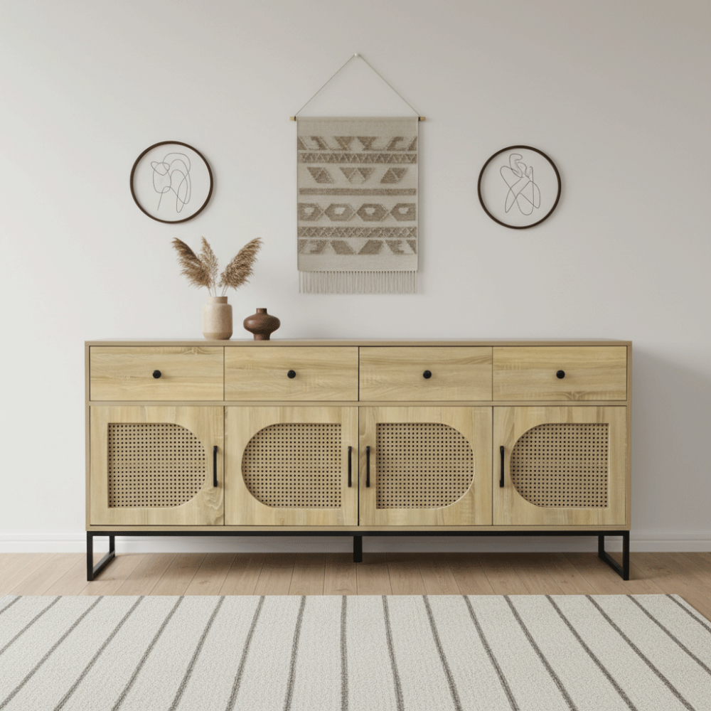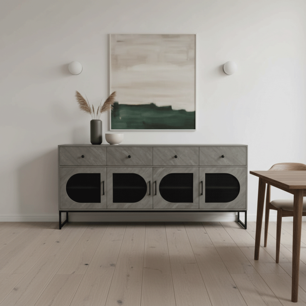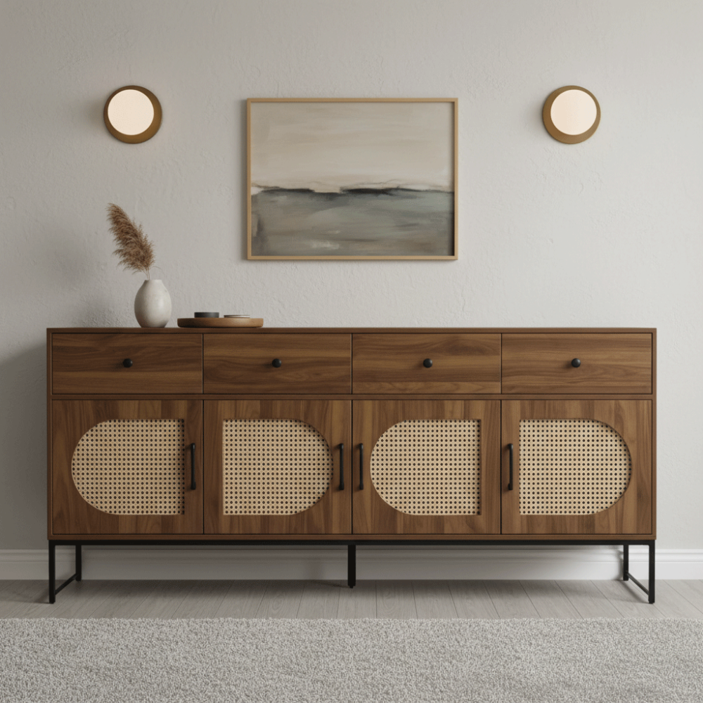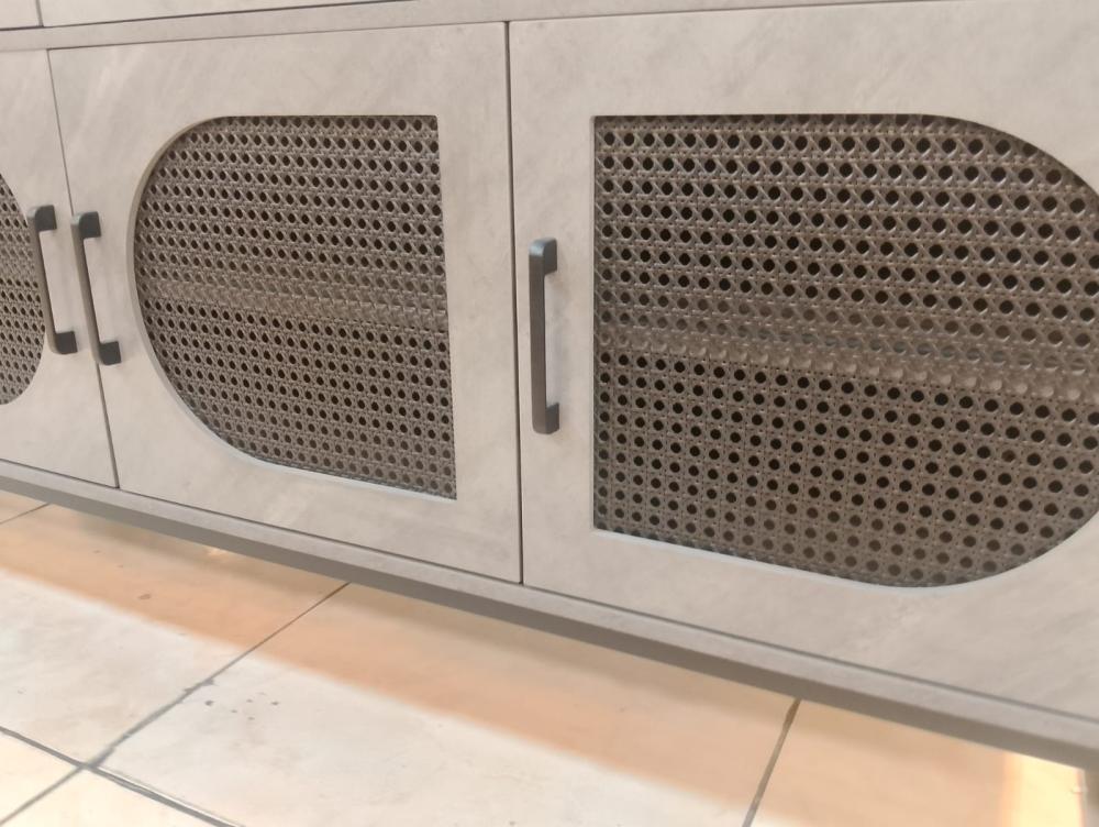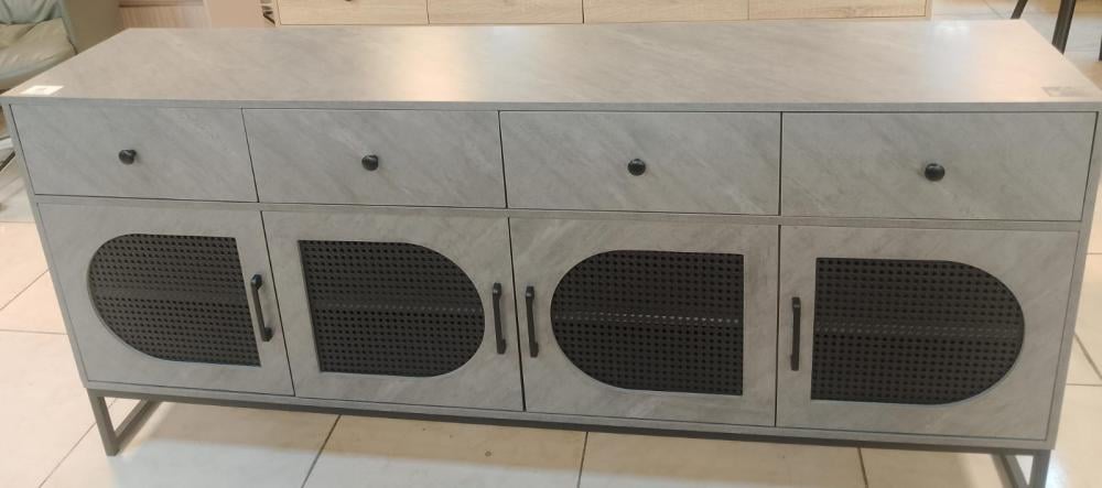 يحتوي هذا البوفيه على أربعة أبواب بتصميم شبكي عصري يضفي لمسة أنيقة ويمنح تهوية مثالية لمحتوياته، إلى جانب أربعة أدراج علوية تساعد في تخزين الأدوات الصغيرة مثل المفارش، أدوات السفرة، أو غيرها من المستلزمات اليومية، مما يجعله قطعة أثاث عملية توفر مساحة تخزين واسعة ومنظمة.