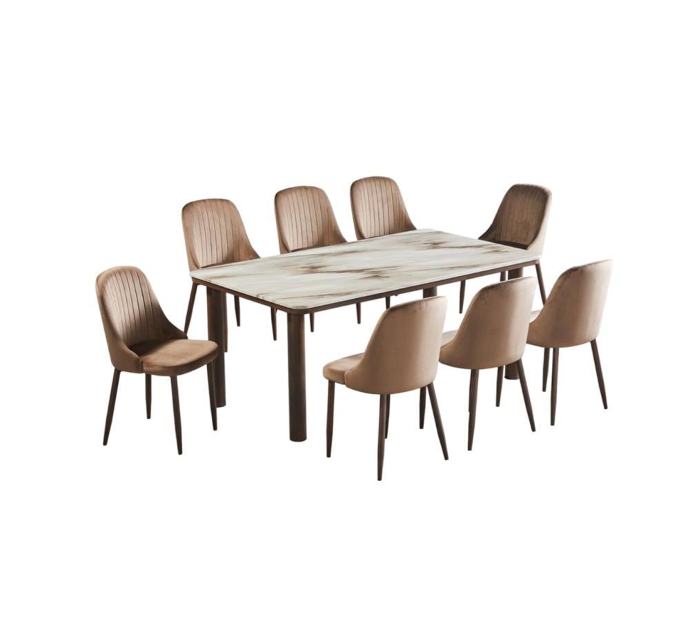 هذا الطقم الأنيق يجمع بين الرقي والأناقة، ويتكون من طاولة طعام ذات سطح رخامي مستوحى من الطبيعة وكراسي مخملية مريحة. يعتبر هذا الطقم الخيار الأمثل لمن يبحثون عن إضافة لمسة من الفخامة إلى غرفة الطعام الخاصة بهم.