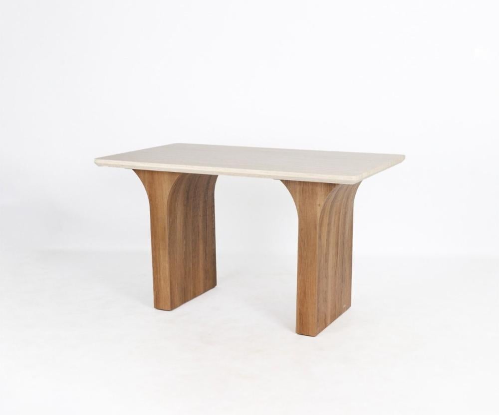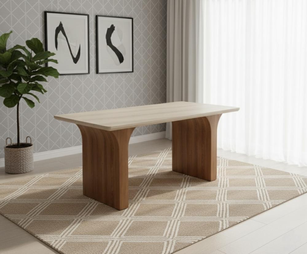 تتميز هذه الطاولة بسطح فاخر بلون كريمي هادئ يضفي لمسة من الرقي على مساحتك، بينما تدعمها قاعدتان خشبيتان بتصميم منحني فريد يشبه الأقواس المعمارية، مما يخلق توازناً مثالياً بين القوة والجمال.