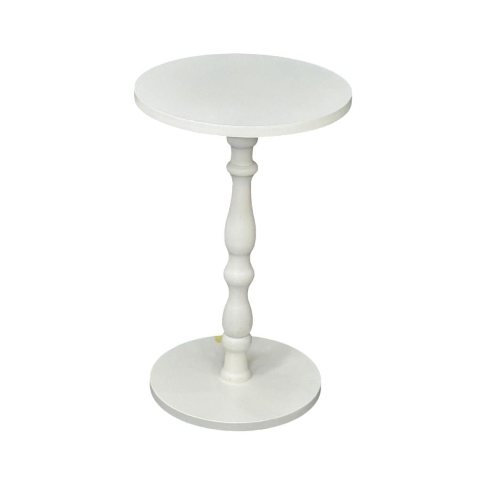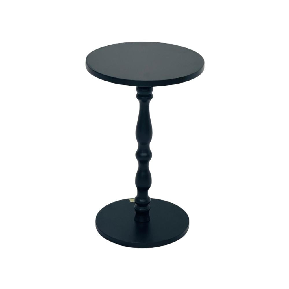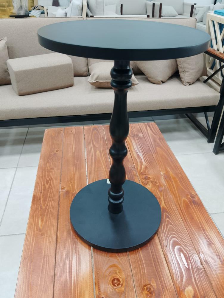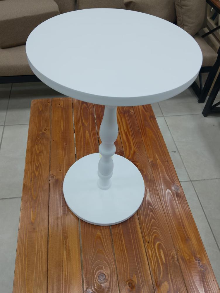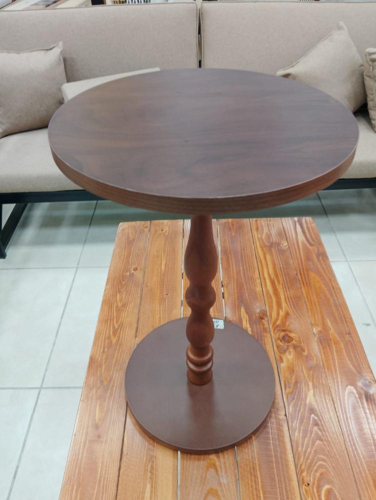 طاولة خدمة خشبية صغيرة بتصميم كلاسيكي أنيق، تتميز بعمود مركزي منحوت بشكل فني جميل يشبه الأعمدة الكلاسيكية التقليدية. العمود مصنوع من الخشب بتفاصيل دقيقة تتضمن انتفاخات وتقعيرات متناسقة تمنح الطاولة طابعاً راقياً وفخماً.