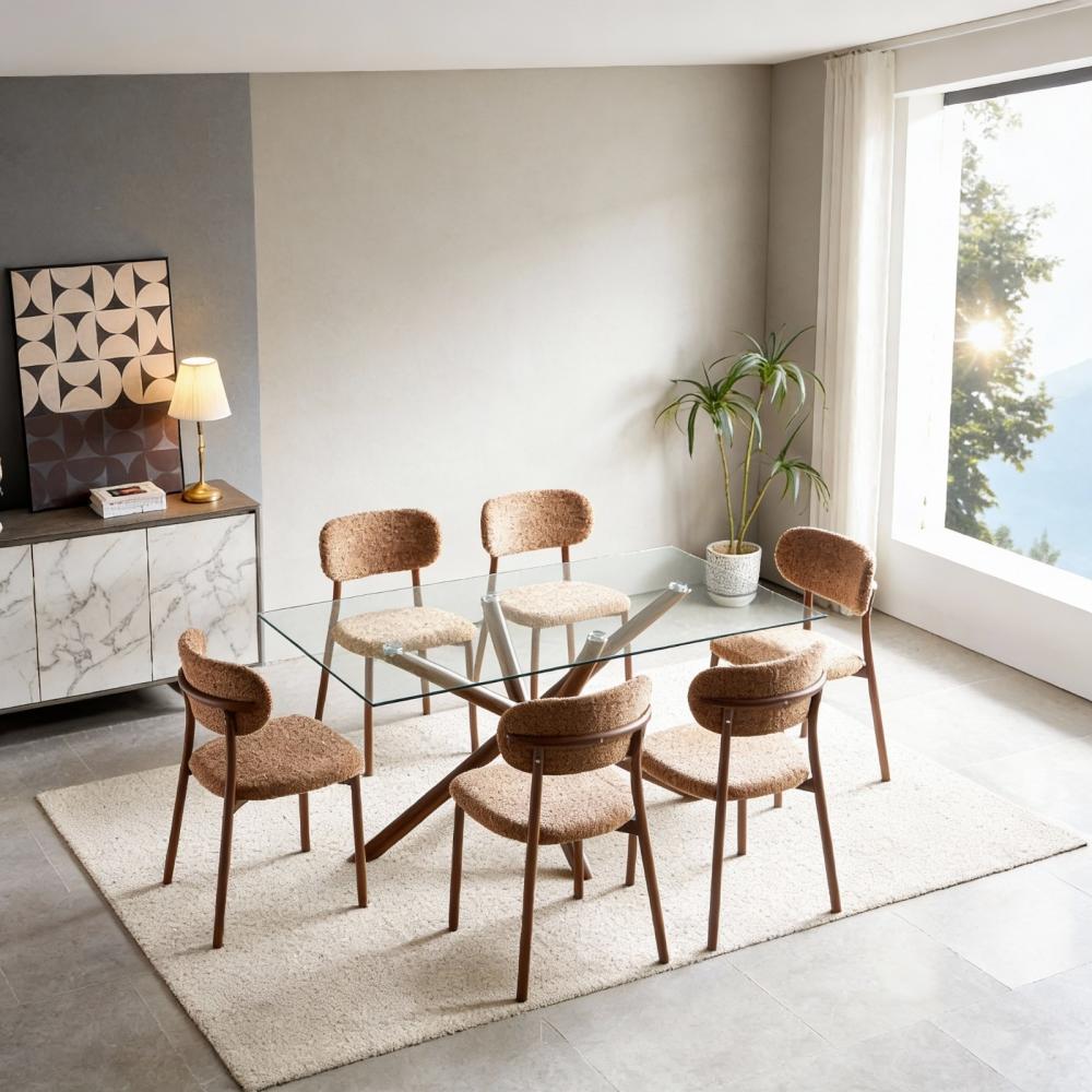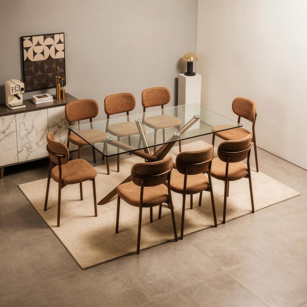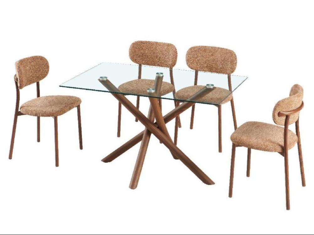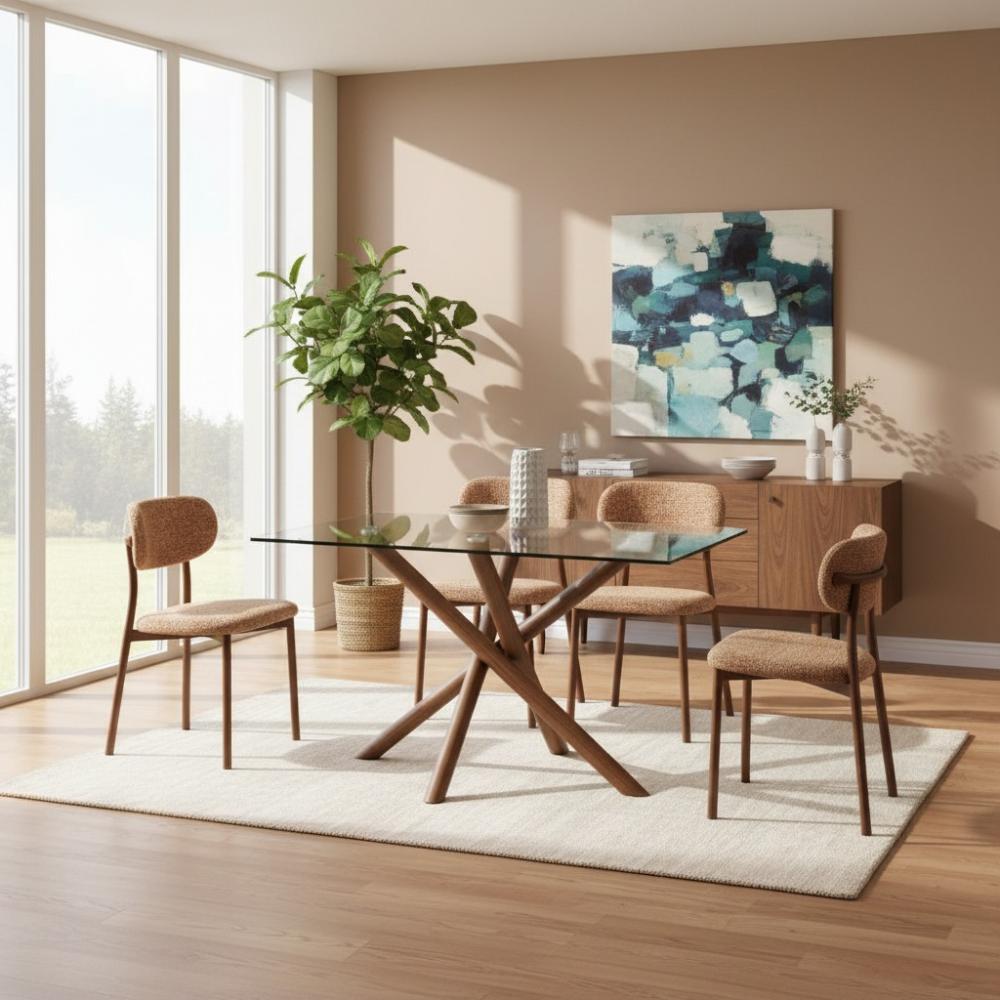 طقم طاولة طعام زجاجية بتصميم عصري يجمع بين جمال المواد الطبيعية وشفافية الزجاج. يتميز هذا الطقم بسطح طاولة زجاجي مستطيل شفاف يمنح إحساساً بالاتساع والنور، وقاعدة خشبية متينة بتصميم متشابك بلون بني دافئ. تكتمل أناقة الطقم بكراسي منجدة بقماش ناعم بلون بني فاتح متناسق مع القاعدة، ومصممة بأرجل خشبية قوية توفر الراحة والأناقة في آن واحد.