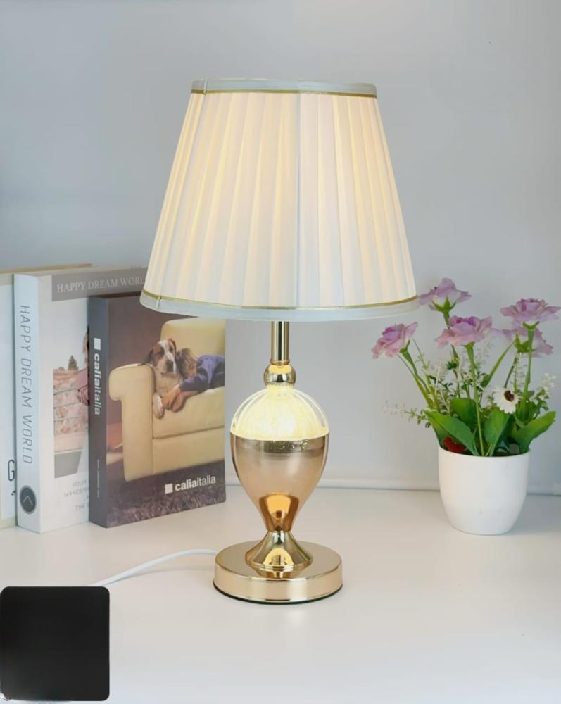 غطاء قماشي ناعم: يغطي المصباح بغطاء قماشي ناعم وأبيض اللون، يعمل على توزيع الضوء بشكل لطيف وخافت، مما يخلق جوًا مريحًا ومناسبًا للقراءة والاسترخاء.