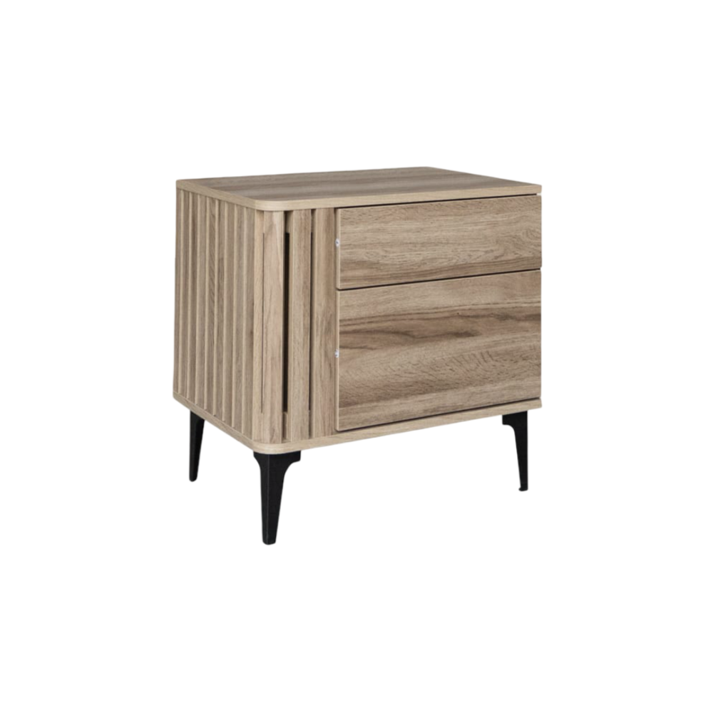 متوفر بخمسة ألوان عصرية ومتنوعة لتناسب كافة الأذواق والديكورات: اللون الخشبي الفاتح الظاهر في الصورة لمنح إحساس بالدفء والطبيعية، والرصاصي لمظهر صناعي حديث، والبني لمسة كلاسيكية غنية، والرمادي لتنسيق سهل وعصري، بالإضافة إلى البيج لمظهر هادئ ومريح. يرتكز الكمودينو على أرجل سوداء قوية وثابتة، تكمل التصميم الحديث وتضمن استقراره.
